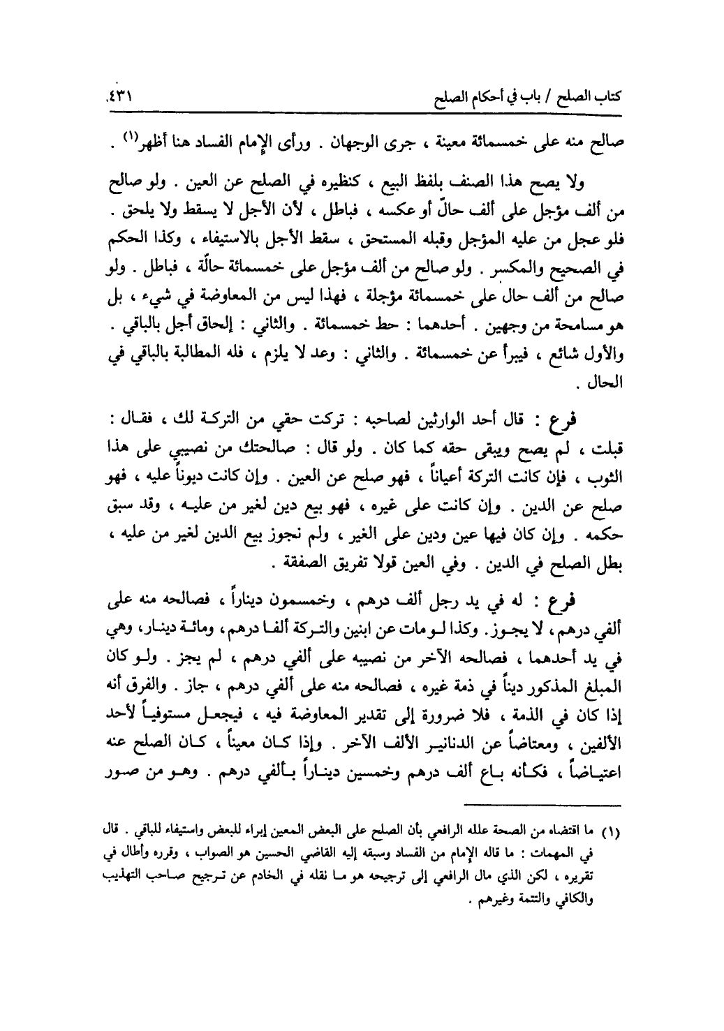 صالح منه على خمسمائة معينة، جرى الوجهان. ورأى الامام الفساد هنا أظهر. ولا يصح هذا الصنف بلفظ البع، كنظيره في الصلح عن العين. ولو صالح من ألف مؤجل على ألف حال أو عكسه. فباطل، لان الاجل لا يسقط ولا يلحق. فلو عجل من عليه المؤجل وقبله المستحق، سقط الاجل بالاستيفاء، وكذا الحكم في الصحيح والمكسر. ولو صالح من ألف مؤجل على خمسمائة، حالة فباطل. ولو صالح من ألف حال على خمسماءة مؤجلة، فهذا ليس من المعاوضة في شئ، بل هو مسامحة من وجهين. أحدهما حط خمسمائة. والثاني: إلحاق أجل بالباقي. والاول شائع، فيبرأ. عن خمسمائة. والثاني: وعد لا يلزم، فله المطالبة بالباقي في الحال. فرع قال أحد الوارثين لصاحبه: تركت حقي من التركة لك، فقال قبلت، لم يصح ويبقى حقه كما كان. ولو قال صالحتك من نصيبي على هذا الثوب، فإن كانت التركة أعيانا، فهو صلح عن العين. وإن كانت ديونا عليه، فهو صلح عن الدين. وإن كانت على غيره، فهو بيع دين لغير من عليه، وقد سبق حكمه. وإن كان فيها عين ودين على الغير، ولم نجوز بيع الدين لغير من عليه، بطل الصلح في الدين. وفي العين قولا تفريق الصفقة. فرع له في يد رجل ألف درهم، وخمسون دينارا، فصالحه منه على ألفي درهم، لا يجوز. وكذا لو مات عن إبنين والتركة ألفا درهم، ومائة دينار، وهي في يد أحدهما، فصالحه الآخر من نصيبه على ألفي درهم، لم يجز. ولو كان المبلغ المذكور دينا في ذمة غيره، فصالحه منه على ألفي درهم، جاز. والفرق أنه إذا كان في الذمة، فلا ضرورة إلى تقدير المعاوضة فيه، فيجعل مستوفيا لاحد الالفين، ومعتاضا عن الدنانير الالف الآخر. وإذا كان معينا، كان الصلح عنه إعتياضا، فكأنه باع ألف درهم وخمسين دينارا بألفي درهم. وهو من صور