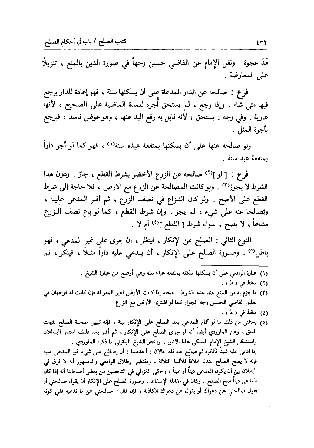 مد عجوة. ونقل الامام عن القاضي حسين وجها في صورة الدين بالمنع، تنزيلا على المعاوضة. فرع صالحه عن الدار المدعاة على أن يسكنها سنة، فهو إعادة للدار يرجع فيها متى شاء. وإذا رجع، لم يستحق أجرة للمدة الماضية على الصحيح، لانها عارية. وفي وجه: يستحق، لانه قابل به رفع اليد عنها، وهو عوض فاسد، فيرجع بأجرة المثل. ولو صالحه عنها على أن يسكنها بمنفعة عبده سنة، فهو كما لو أجر دارا بمنفعة عبد سنة. فرع صالح عن الزرع الاخضر بشرط القطع، جاز. ودون هذا الشرط لا يجوز. ولو كانت المصالحة عن الزرع مع الارض، فلا حاجة إلى شرط القطع على الاصح. ولو كان النزاع في نصف الزرع، ثم أقر المدعى عليه، وتصالحا عنه على الشئ، لم يجز. وإن شرطا القطع، كما لو با نصف الزرع مشاعا، لا يصح، سواء شرط، أم لا. النوع الثاني: الصلح عن الانكار، فينظر، إن جرى على غير المدعى، فهو باطل. وصورة الصلح على الانكار، أن يدعي عليه دارا مثلا، فينكر، ثم