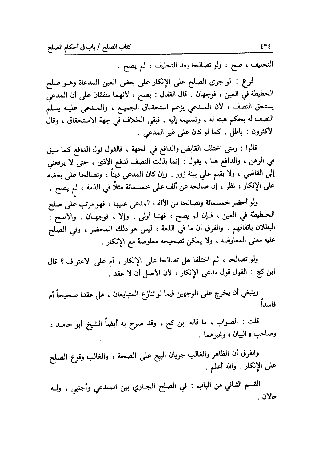 التحليف، لو صح، ولو تصالحا بعد التحليف، لم يصح. فرع لو جرى الصلح على الانكار على بعض العين المدعاة وهو صلح الحطيطة في العين، فوجهان. قال القفال: يصح، لانهما متفقان على أن المدعي يستحق النصف، لان المدعي يزعم إستحقاق الجميع، والمدعى عليه يسلم النصف له بحكم هبته له، وتسليمه إليه، فبقي الخلاف في جهة الاستحقاق، وقال الاكثرون: باطل، كما لو كان على غير المدعي. قالوا: ومتى اختلف القابض والدافع في الجهة، فالقول قول الدافع كما سبق في الرهن. والدافع هنا، يقول: إنما بذلت النصف لدفع الاذى، حتى لا يرفعني إلى القاضي، ولا يقيم علي بينة زور. وإن كان المدعى دينا، وتصالحا على بعضه على الانكار، نظر، إن صالحه عن ألف على خمسمائة مثلا في الذمة، لم يصح. ولو أحضر الخمسمائة وتصالحا من الالف المدعى عليها، فهو مرتب على صلح الحطيطة في العين. فإن لم يصح، فهنا أولى. وإلا، فوجهان. والاصح: البطلان باتفاقهم. والفرق أن ما في الذمة، ليس هو ذلك المحضر، وفي الصلح عليه معنى المعاوضة، ولا يمكن تصحيحه معاوضة مع الانكار. ولو تصالحا، ثم اختلفا هل تصالحا على الانكار، أم على الاعتراف ؟ قال ابن كج: القول قول مدعي الانكار، لان الاصل أن لا عقد. وينبغي أن يخرج على الوجهين فيما لو تنازع المتبايعان، هل عقدا صحيحا أم فاسدا. قلت: الصواب، ما قاله ابن كج وقد صرح به أيضا الشيخ أبو حامد، وصاحب البيان وغيرهما. والفرق أن الظاهر والغالب جريان البيع على الصحة، والغالب وقوع الصلح على الانكار. والله أعلم.