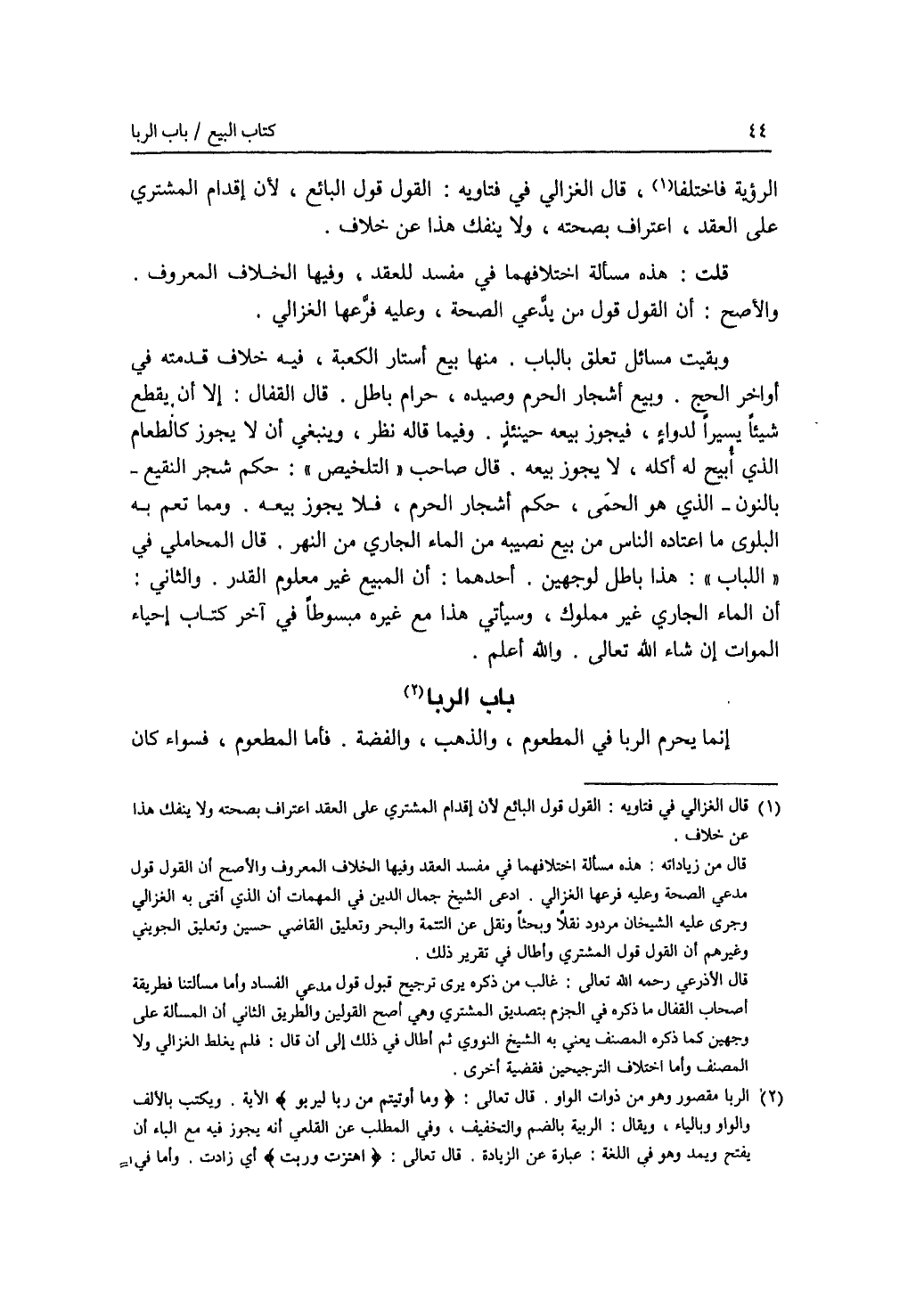 الرؤية فاختلفا، قال الغزالي في فتاويه: القول قول البائع، لان إقدام المشتري على العقد، اعتراف بصحته، ولا ينفك هذا عن خلاف. قلت: هذه مسألة اختلافهما في مفسد للعقد، وفيها الخلاف المعروف. والاصح: أن القول قول من يدعي الصحة، وعليه فرعها الغزالي. وبقيت مسائل تعلق بالباب، منها بيع أستار الكعبة، فيه خلاف قدمته في أواخر الحج. وبيع أشجار الحرم وصيده، حرام باطل. قال القفال: إلا أن يقطع شيئا يسيرا لدواء، فيجوز بيعه حينئذ. وفيما قاله نظر، وينبغي أن لا يجوز كالطعام الذي أبيح له أكله، لا يجوز بيعه. قال صاحب التلخيص: حكم شجر النقيع - بالنون - الذي هو الحمى، حكم أشجار الحرم، فلا يجوز بيعه. ومما تعم به البلوى ما اعتاده الناس من بيع نصيبه من الماء الجاري لن النهر. قال المحاملي في اللباب: هذا باطل لوجهين. أحدهما: أن المبيع غير معلوم القدر. والثاني: أن الماء الجاري غير مملوك، وسيأتي هذا مع غيره مبسوطا في آخر كتاب إحياء الموات إن شاء الله تعالى. والله أعلم.