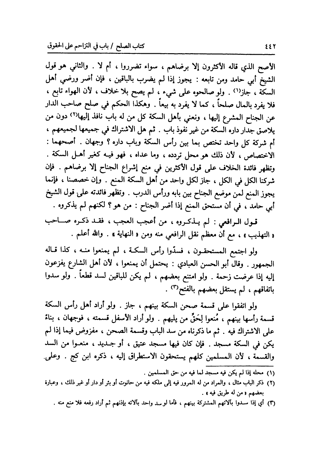 الاصح الذي قاله الاكثرون إلا برضاهم، سواء تضرروا، أم لا. والثاني وهو قول الشيخ أبي حامد ومن تابعه: يجوز إذا لم يضر الباقين، فإن أضر ورضي أهل السكة جاز. ولو صالحوه على شئ، لم يصح بلا خلاف، لان الهواء تابع، فلا يفرد بالمال صلحا، كما لا يفرد به بيعا. وهكذا الحكم في صلح صاحب الدار عن الجناح المشرع إليها، ونعني بأهل السكة كل من له باب نافذ إليها دون من يلاصق جدار دار السكة من غير نفوذ باب. ثم هل الاشتراك في جميعها لجميعهم، أم شركة كل واحد تختص بما بين رأس السكة وباب داره ؟ وجهان. أصحهما: الاختصاص، لان ذلك هو محل تردده، وما عداه، فهو فيه كغير أهل السكة. وتظهر فائدة الخلاف على قول الاكثرين في منع إشراع الجناح إلا برضاهم. فإن شركنا الكل في الكل، جاز لكل واحد من أهل السكة المنع. وإن خصصنا، فإنما يجوز المنع لمن موضع الجناح بين بابه ورأس الدرب. وتظهر فائدته على قول الشيخ أبي حامد، في أن مستحق المنع إذا أضر الجناح: من هو ؟ لكنهم لم يذكروه. قول الرافعي: لم يذكروه، من أعجب العجب، فقد ذكره صاحب التهذيب، مع أن معظم نقل الرافعي منه ومن النهاية. والله أعلم. ولو اجتمع المستحقون فسدوا رأس السكة، لم يمنعوا منه، كذا قاله الجمهور. وقال أبو الحسن العبادي: يحتمل أن يمنعوا، لان أهل الشارع يفزعون إليه إذا عرضت زحمة. ولو امتنع بعضهم، لم يكن للباقين السد قطعا. ولو سدوا باتفاقهم، لم يستقل بعضهم بالفتح. ولو اتفقوا على قسمة صحن السكة بينهم، جاز. ولو أراد أهل رأس السكة قسمة رأسها بينهم، منعوا لحق من يليهم. ولو أراد الاسفل قسمته فوجهان، بناء على الاشتراك فيه، ثم ما ذكرناه من سد الباب وقسمة الصحن، مفروض فيما لو لم يكن في السكة مسجد. فإن كان فيها مسجد عتيق، أو جديد، منعو من السد والقسمة، لان المسلمين كلهم يستحقون الاستطراق إليه، ذكره ابن كج. وعلى