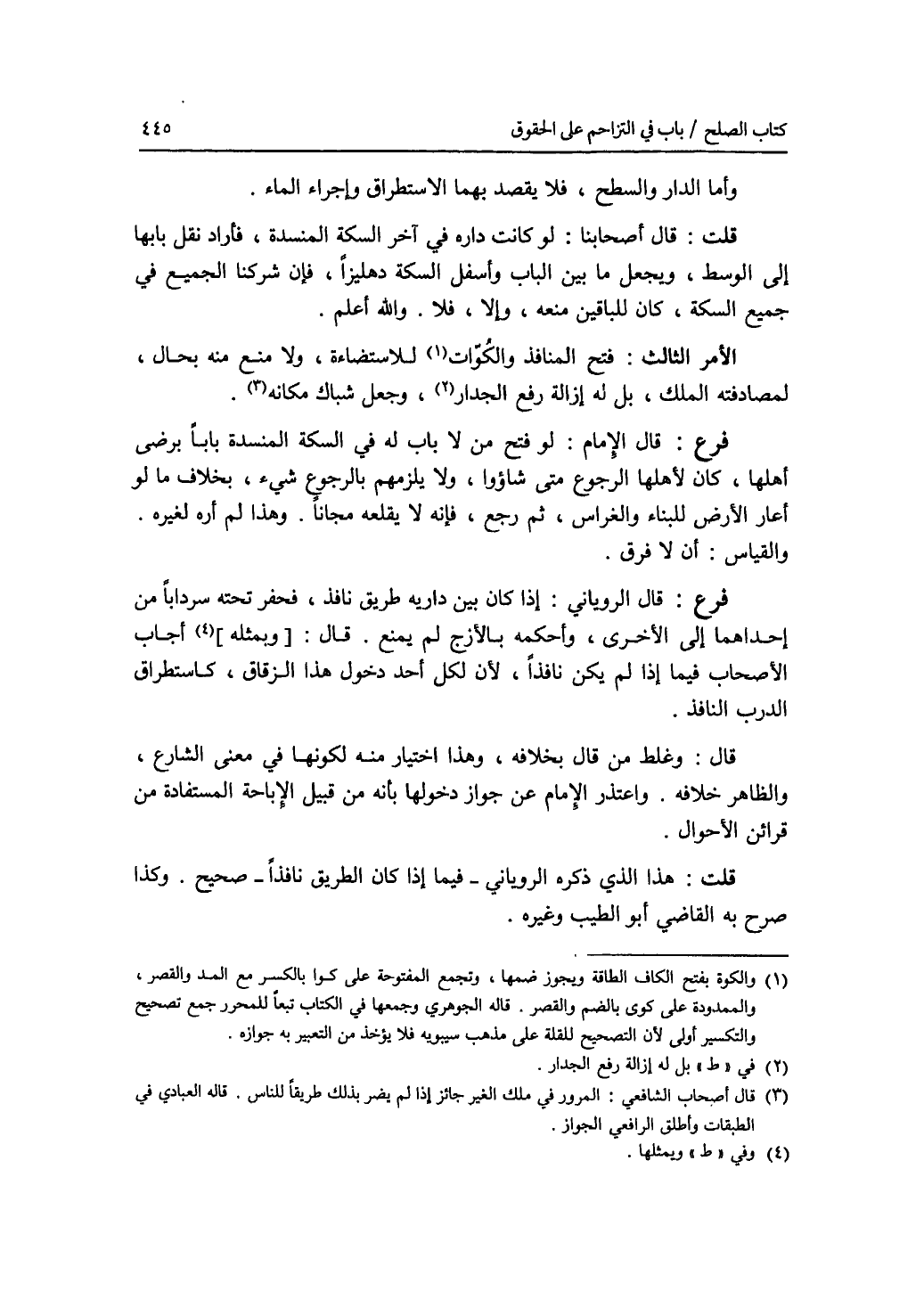 وأما الدار والسطح، فلا يقصد بهما الاستطراق وإجراء الماء. قلت: قال أصحابنا: لو كانت داره في آخر السكة المنسدة، فأراد نقل بابها إلى الوسط، ويجعل ما بين الباب وأسفل السكة دهليزا، فإن شركنا الجميع في جميع السكة، كان للباقين منعه، وإلا، فلا. والله أعلم. الامر الثالث: فتح المنافذ والكوات للاستضاءة، ولا منع منه بحال، لمصادفته الملك، بل له إزالة رفع الجدار، وجعل شباك مكانه. فرع قال الامام: لو فتح من لا باب له في السكة المنسدة بابا برضى أهلها، كان لاهلها الرجوع متى شاؤوا، ولا يلزمهم بالرجوع شئ، بخلاف ما لو أعار الارض للبناء والغراس، ثم رجع، فإنه لا يقلعه مجانا. وهذا لم أره لغيره. والقياس: أن لافرق. فرع قال الروياني: إذا كان بين داريه طريق نافذ، فحفر تحته سردابا من إحداهما إلى الاخرى، وأحكمه بالازج لم يمنع. قال: وبمثلها أجاب الاصحاب فيما إذا لم يكن نافذا، لان لكل أحد دخول هذا الزقاق، كاستطراق الدرب النافذ. قال: وغلط من قال بخلافه، وهذا اختيار منه لكونها في معنى الشارع، والظاهر خلافه. واعتذر الامام عن جواز دخولها بأنه من قبيل الاباحة المستفادة من قرائن الاحوال. قلت: هذا الذي ذكره الروياني - فيما كان الطريق نافذا - صحيح. وكذا صرح به القاضي أبو الطيب وغيره.