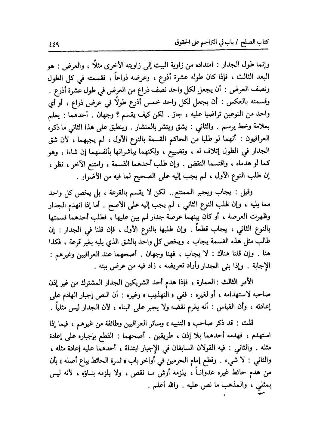 وإنما طول الجدار: امتداده زاويته البيت إلى زاوته الاخرى مثلا، والعرض: هو البعد الثالث، فإذا كان طوله عشرة أذرع، وعرضه ذراعا، فقسمته في كل الطول ونصف العرض: أن يجعل لكل واحد نصف ذراع من العرض في طول عشرة أذرع. وقسمته بالعكس: أن يجعل لكل واحد خمسة أذرع طولا في عرض ذراع، أو أي واحدا من النوعين تراضيا عليه، جاز. لكن كيف يقسم ؟ وجهان. أحدهما: يعلم بعلامة وخط يرسم. والثاني: يشق وينشر بالمنشار. وينطبق على هذا الثاني ما ذكره العراقيون: أنهما لو طلبا من الحاكم القسمة بالنوع الاول، لم يجبهما، لان شق الجدار في الطول إتلاف له، وتضييع، ولكنهما يباشرانها بأنفسهما إن شاءا، وهو كما لو هدماه، واقتسما النقض. وإن طلب أحدهما القسمة، وامتنع الآخر، نظر، إن طلب النوع الاول، لم يجب إليه على الصحيح لما فيه من الاضرار. وقيل: يجاب ويجبر الممتنع، لكن لا يقسم بالقرعة، بل يخص كل واحد مما يليه. وإن طلب النوع الثاني، لم يجب إليه على الاصح. أما إذا انهدم الجدار وظهرت العرصة، أو كان بينهما عرصة جدار لم يبن عليها، فطلب أحدهما قسمتها بالنوع الثاني، يجاب قطعا. وإن طلبها بالنوع الاول، فإن قلنا في الجدار: إن طالب مثل هذه القسمة يجاب، ويخص كل واحد بالشق الذي يليه بغير قرعة، فكذا هنا. وإن قلنا هناك: لا يجاب، فهنا وجهان. أصحهما عند العراقيين وغيرهم: الاجابة. وإذا بنى الجدار وأراد تعريضه، زاد فيه من عرض بيته. الامر الثالث: العمارة، فإذا هدم أحد الشريكين الجدار المشترك من غير إذن صاحبه لاستهدامه، أو لغيره، ففي التهذيب وغيره: أن النص إجبار الهادم على إعادته، وأن القياس: أنه يغرم نقضه ولا يجبر على البناء، لان الجدار ليس مثليا. قلت: قد ذكر صاحب التنبيه وسائر العراقيين وطائفة من غيرهم، فيما إذا استهدم، فهدمه أحدهما بلا إذن، طريقين. أصحهما: القطع بإجباره على إعادة مثله. والثاني: فيه القولان السابقان في الاجبار إبتداء، أحدهما عليه إعادة مثله، والثاني: لا شئ. وقطع إمام الحرمين في أواخر باب ثمرة الحائط يباع أصله بأن من هدمك حائط غيره عدوانا، يلزمه أرش ما نقص، ولا يلزمه بناؤه، لانه ليس بمثلي، والمذهب ما نص عليه. والله أعلم.