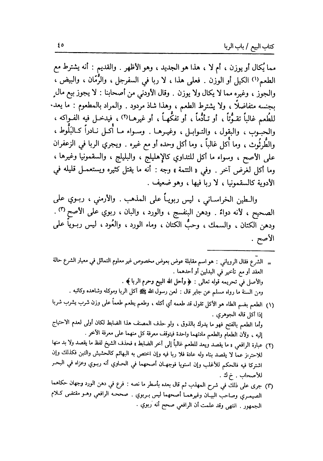 مما يكال أو يوزن، أم لا، هذا هو الجديد، وهو الاظهر. والقديم: أنه يشترط مع الطعم الكيل أو الوزن. فعلى هذا، لا ربا في السفرجل، والرمان، والبيض، والجوز، وغيره مما لا يكال ولا يوزن. وقال الاودني من أصحابنا: لا يجوز بيع مال بجنسه متفاضلا، ولا يشترط الطعم، وهذا شاذ مردود. والمراد بالمطعوم: ما يعد للطعم غالبا تقوتا، أو تأدما، أو تفكها، أو غيرها، فيدخل في الفواكه، والحبوب، والبقول، والتوابل، وغيرها. وسواء ما أكل نادرا كالبلوط، والطرثوث، وما أكل غالبا، وما أكل وحده أو مع غيره. ويجري الربا في الزعفران على الاصح، وسواء ما أكل للتداوي كالاهليلج، والبليلج، والسقمونيا وغيرها، وما أكل لغرض آخر. وفي التتمة وجه: أنه ما يقتل كثيره ويستعمل قليله في الادوية كالسقمونيا، لا ربا فيها، وهو ضعيف. والطين الخراساني، ليس ربويا على المذهب. والارمني، ربوي على الصحيح، لانه دواء. ودهن البنفسج، والورد، والبان، ربوي على الاصح. ودهن الكتان، والسمك، وحب الكتان، وماء الورد، والعود، ليس ربويا على الاصح.