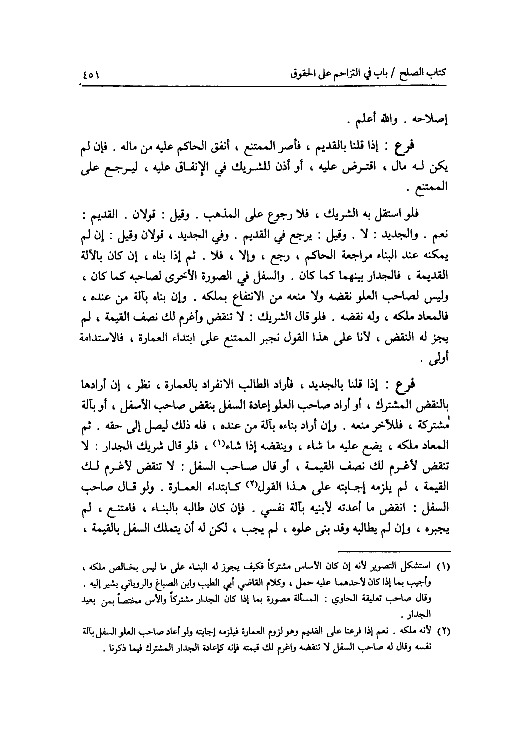 إصلاحه. والله أعلم. فرع إذا قلنا بالقديم، فأصر الممتنع، أنفق الحاكم عليه من ماله. فإن لم يكن له مال، اقترض عليه، أو أذن الشريك في الانفاق عليه، ليرجع على الممتنع. فلو استقل به للشريك، فلا رجوع على المذهب. وقيل: قولان. القديم: نعم. والجديد: لا. وقيل: يرجع في القديم. وفي الجديد، قولان وقيل: إن لم يمكنه عند البناء مراجعة الحاكم، رجع، وإلا، فلا. ثم إذا بناه، إن كان بالآلة القديمة، فالجدار بينهما كما كان. والسفل في الصورة الاخرى لصاحبه كما كان، وليس لصاحب العلو نقضه ولا منعه من الانتفاع بملكه. وإن بناه بآلة من عنده، فالمعاد ملكه، وله نقضه. فلو قال الشريك: لا تنقض وأغرم لك نصف القيمة، لم يجز له النقض، لانا على هذا القول نجبر الممتنع على ابتداء العمارة، فالاستدامة أولى. فرع إذا قلنا بالجديد، فأراد الطالب الانفراد بالعمارة، نظر، إن أرادها بالنقض المشترك، أو أراد صاحب العلو إعادة السفل بنقض صاحب الاسفل، أو بآلة مشتركة، فللآخر منعه. وإن أراد بناءه بآلة من عنده، فله ذلك ليصل إلى حقه. ثم المعاد ملكه، يضع عليه ما شاء، وينقضه إذا شاء. فلو قال شريك الجدار: لا تنقض لاغرم لك نصف القيمة، أو قال صاحب السفل: لا تنقض لاغرم لك القيمة، لم يلزمه إجابته على هذا القول كابتداء العمارة. ولو قال صاحب السفل: انقض ما أعدته لابنيه بآلة نفسي. فإن كا طالبه بالبناء، فامتنع، لم يجبره، وإن لم يطالبه وقد بنى علوه، لم يجب، لكن له أن يتملك السفل بالقيمة،