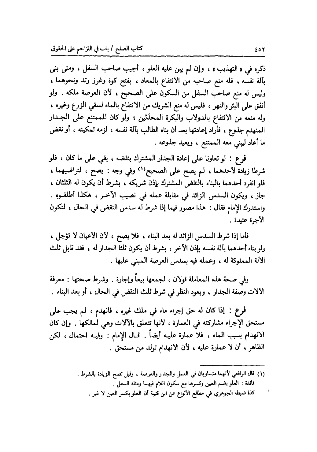 ذكره في التهذيب، وإن لم يبن عليه العلو، أجيب صاحب السفل، ومتى بنى بآلة نفسه، فله منع صاحبه من الانتفاع بالمعاد، بفتح كوة وغرز وتد ونحوهما، وليس له منع صاحب السفل من السكون على الصحيح، لان العرصة ملكه. ولو أنفق على البئر والنهر، فليس له منع الشريك من الانتفاع بالماء لسقي الزرع وغيره، وله منعه من الانتفاع بالدولاب والبكرة المحدثين. ولو كان للممتنع على الجدار المنهدم جذوع، فأراد إعادتها بعد أن بناه الطالب بآلة نفسه، لزمه تمكينه، أو نقض ما أعاد ليبني معه الممتنع، ويعيد جذوعه. فرع لو تعاونا على إعادة الجدار المشترك بنقضه، بقي على ما كان. فلو شرطا زيادة لاحدهما، لم يصح على الصحيح. وفي وجه: يصح، لتراضيهما. فلو انفرد أحدهما بالبناء بالنقض المشترك بإذن شريكه، بشرط أن يكون له الثلثان، جاز، ويكون السدس الزائد في مقابلة عمله في نصيب الآخر، هكذا أطلقوه. واستدرك الامام فقال: هذا مصور فيما إذا شرط له سدس النقض في الحال، لتكون الاجرة عتيدة. فأما إذا شرط السدس الزائد له بعد البناء، فلا يصح، لان الاعيان لا تؤجل. ولو بناه أحدهما بآلة نفسه بإذن الآخر، بشرط أن يكون ثلثا الجدار له، فقد قابل ثلث الآلة المملوكة له، وعمله فيه بسدس العرصة المبني عليها. وفي صحة هذه المعاملة قولان، لجمعها بيعا وإجارة. وشرط صحتها: معرفة الآلات وصفة الجدار، ويعود النظر في شرط ثلث النقض في الحال، أو بعد البناء. فرع إذا كان له حق إجراء ماء في ملك غيره، فانهدم، لم يجب على مستحق الاجراء مشاركته في العمارة، لانها تتعلق بالآلات وهي لمالكها. وإن كان الانهدام بسبب الماء، فلا عمارة عليه أيضا. قال الامام: وفيه احتمال، لكن الظاهر، أن لا عمارة عليه، لان الانهدام تولد من مستحق.