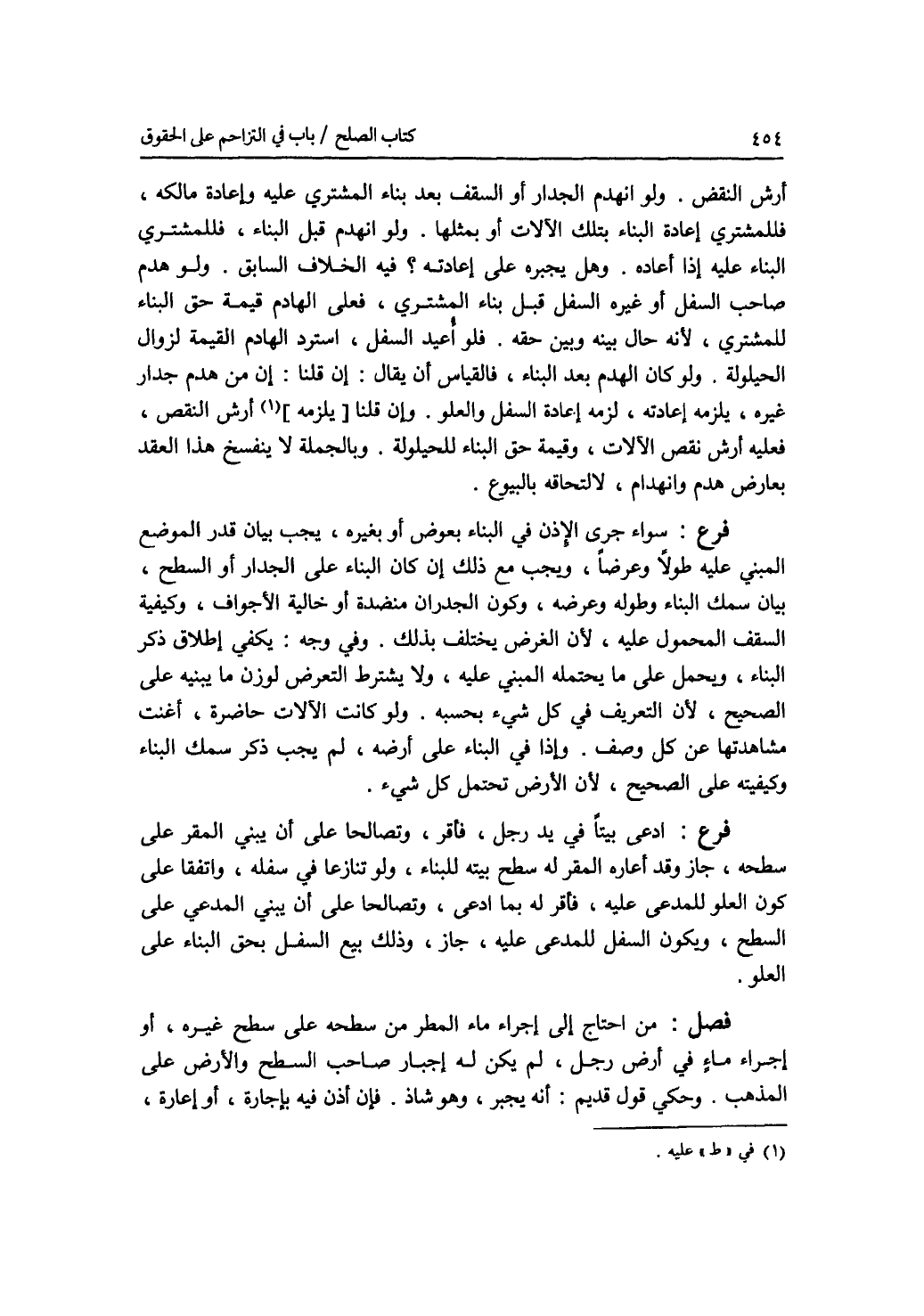 أرش النقض. ولو انهدم الجدار أو السقف بعد بناء المشتري عليه وإعادة مالكه، فللمشتري إعادة البناء بتلك الآلات أو بمثلها. ولو انهدم قبل البناء، فللمشتري البناء عليه إذا أعاده. وهلل يجبره على إعادته ؟ فيه الخلاف السابق. ولو هدم صاحب السفل أو غيره السفل قبل بناء المشتري، فعلى الهادم قيمة حق البناء للمشتري، لانه حال بينه وبين حقه. فلو أعيد السفل، استرد الهادم القيمة لزوال ا لحيلولة. ولو كان الهدم بعد البناء، فالقياس أن يقال: إن قلنا: إن من هدم جدار غيره، يلزمه إعادته، لزمه إعادة السفل والعلو. وإن قلنا: عليه أرش النقص، فعليه أرش نقص الآلات، وقيمة حق البناء للحيلولة. وبالجملة لا ينفسخ هذا العقد بعارض هدم وانهدام، لالتحاقه بالبيوع. فرع سواء جرى الاذن في البناء بعوض أو بغيره، يجب بيان قدر الموضع المبني عليه طولا وعرضا، ويجب مع ذلك إن كان البناء على الجدار أو السطح، بيان سمك البناء وطوله وعرضه، وكون الجدران منضدة أو خالية الاجواف، وكيفية السقف المحمول عليه، لان الغرض يختلف بذلك. وفي وجه: يكفي إطلاق ذكر البناء، ويحمل على ما يحتمله المبني عليه، ولا يشترط التعرض لوزن ما يبنيه على الصحيح، لان التعريف في كل شئ بحسبه. ولو كانت الآلات حاضرة، أغنت مشاهدتها عن كل وصف. وإذا أذن في البناء على أرضه، لم يجب ذكر سمك البناء وكيفيته على الصحيح، لان الارض تحتمل كل شئ. فرع ادعى بيتا في يد رجل، فأقر، وتصالحا على أن يبني المقر على سطحه، جاز وقد أعاره المقر له سطح بيته للبناء. ولو تنازعا في سفله، واتفقا على كون العلو للمدعى عليه، فأقر له بما ادعى، وتصالحا على أن يبني المدعي على السطح، ويكون السفل للمدعى عليه، جاز، وذلك بيع السفل بحق البناء على العلو. فصل من احتاج إلى إجراء ماء المطر من سطحه على سطح غيره، أو إجراء ماء في أرض رجل، لم يكن له إجبار صاحب السطح والارض على المذهب. وحكي قول قديم: أنه يجبر، وهو شاذ. فإن أذن فيه بإجارة، أو إعارة،