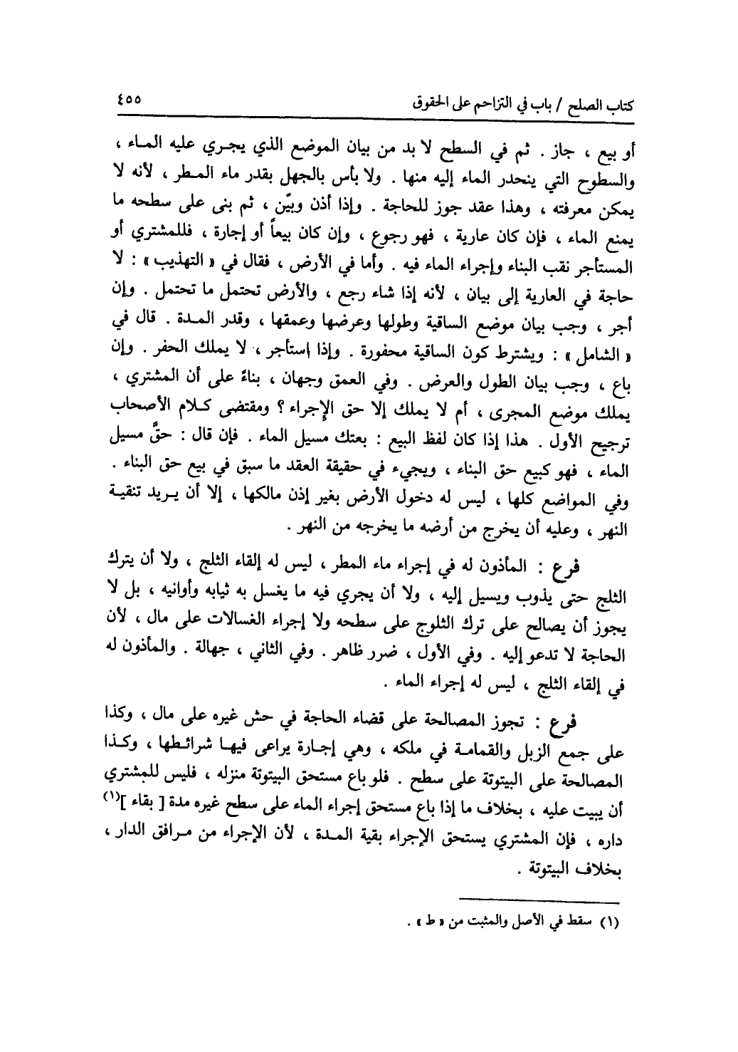 أو بيع، جاز. ثم في السطح لا بد من بيان الموضع الذي يجري عليه الماء، والسطوح التي ينحدر الماء إليه منها. ولا بأس بالجهل بقدر ماء المطر، لانه لا يمكن معرفته، وهذا عقد جوز للحاجة. وإذا أذن وبين، ثم بنى على سطحه ما يمنع الماء، فإن كان عارية، فهو رجوع، وإن كان بيعا أو إجارة، فللمشتري أو المستأجر نقب البناء وإجراء الماء فيه. وأما في الارض، فقال في التهذيب: لا حاجة في العارية إلى بيان، لانه إذا شاء رجع، والارض تحتمل ما تحتمل. وإن أجر، وجب بيان موضع الساقية وطولها وعرضها وعمقها، وقدر المدة. قال في الشامل: ويشترط كون الساقية محفورة. وإذا استأجر، لا يملك الحفر. وإن باع، وجب بيان الطول والعرض. وفي العمق وجهان، بناء على أن المشتري، يملك موضع المجرى، أم لا يملك إلا حق الاجراء ؟ ومقتضى كلام الاصحاب ترجيح الاول. هذا إذا كان لفظ البيع: بعتك مسيل الماء. فإن قال: حق مسيل الماء، فهو كبيع حق البناء، ويجئ في حقيقة العقد ما سبق في بيع حق البناء. وفي المواضع كلها، ليس له دخول الارض بغير إذن مالكها، إلا أن يريد تنقية النهر، وعليه أن يخرج من أرضه ما يخرجه من النهر. فرع المأذون له في إجراء ماء المطر، ليس له إلقاء الثلج، ولا أن يترك الثلج حتى يذوب ويسيل إليه، ولا أن يجري فيه ما يغسل به ثيابه وأوانيه، بل لا يجوز أن يصالح على ترك الثلوج على سطحه ولا إجراء الغسالات على مال، لان الحاجة لا تدعو إليه. وفي الاول، ضرر ظاهر. وفي الثاني، جهالة. والمأذون له في إلقاء الثلج، ليس له إجراء الماء. فرع تجوز المصالحة على قضاء الحاجة في حش غيره على مال، وكذا على جمع الزبل والقمامة في ملكه، وهي إجارة يراعى فيها شرائطها، وكذا المصالحة على البيتوتة على سطح. فلو باع مستحق البيتوتة منزله، فليس للمشتري أن يبيت عليه، بخلاف ما إذا باع مستحق إجراء الماء على غيره مدة [ بقاء ] داره، فإن المشتري يستحق الاجراء بقية المدة، لان الاجراء من مرافق الدار، بخلاف البيتوتة.