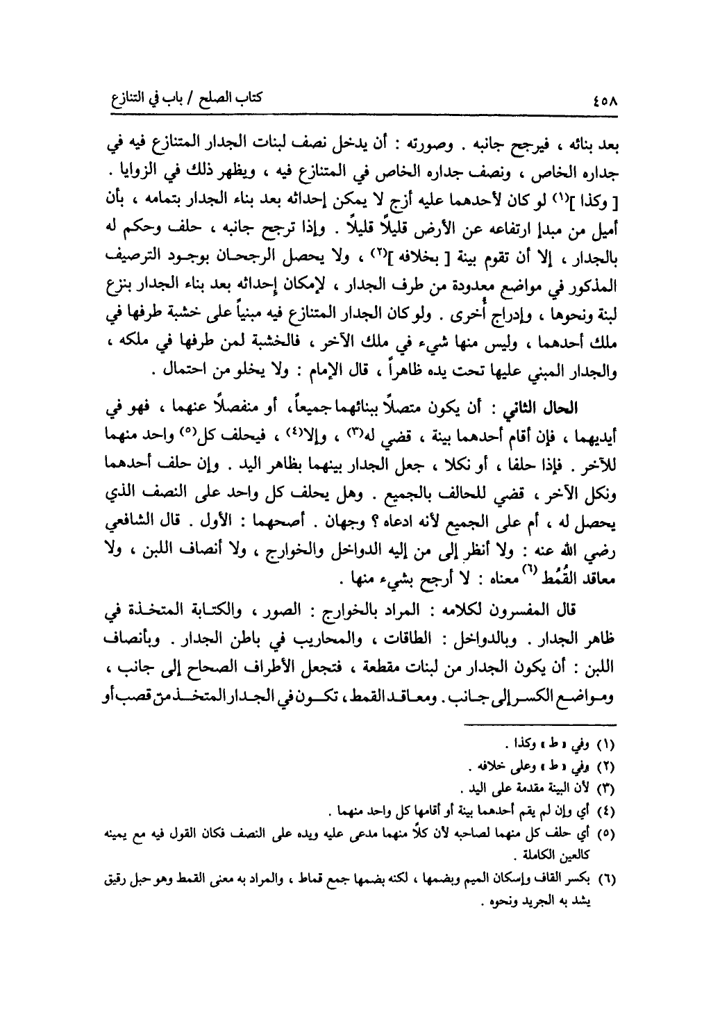 بعد بنائه، فيرجح جانبه. وصورته: أن يدخل نصف لبناء الجدار المتنازع فيه في جداره الخاص، ونصف جداره الخاص في المتنازع فيه، ويظهر ذلك في الزوايا. وكذلك لو كان لاحدهما عليه أزج لا يمكن إحداثه بعد بناء الجدار بتمامه، بأن أميل من مبدإ ارتفاعه عن الارض قليلا. وإذا ترجح جانبه، حلف وحكم له بالجدار، إلا أن تقوم بينة على خلافه. ولا يحصل الرجحان بوجود الترصيف المذكور في مواضع معدودة من طرف الجدار، لامكان إحداثه بعد بناء الجدار بنزع لبنة ونحوها، وإدراج أخرى. ولو كان الجدار المتنازع فيه مبنيا على خشبة طرفها في ملك أحدهما، وليس منها شئ في ملك الآخر، فالخشبة لمن طرفها في ملكه، والجدار المبني عليها تحت يده ظاهرا، قال الامام: ولا يخلو من احتمال. الحال الثاني: أن يكون متصلا ببنائهما جميعا، أو منفصلا عنهما، فهو في أيديهما، فإن أقام أحدهما بينة، قضي له، وإلا، فيحلف كل واحد منهما للآخر. فإذا حلفا، أو نكلا، جعل الجدار بينهما بظاهر اليد. وإن حلف أحدهما ونكل الآخر، قضى للحالف بالجميع. وهل يحلف كل واحد على النصف الذي يحصل له، أم على الجميع لانه ادعاه ؟ وجهان. أصحهما: الاول. قال الشافعي رضي الله عنه: ولا أنظر إلى من إليه الدواخل والخوارج، ولا أنصاف اللبن، ولا معاقد القمط معناه: لا أرجح بشئ منها. قال المفسرون لكلامه: المراد بالخوارج: الصور، والكتابة المتخذة في ظاهر الجدار. وبالدواخل: الطاقات، والمحاريب في باطن الجدار. وبأنصاف اللبن: أن يكون الجدار من لبنات مقطعة، فتجعل الاطراف الصحاح إلى جانب، ومواضع الكسر إلى جانب. ومعاقد القمط، تكون في الجدار المتخذ من قصب أو