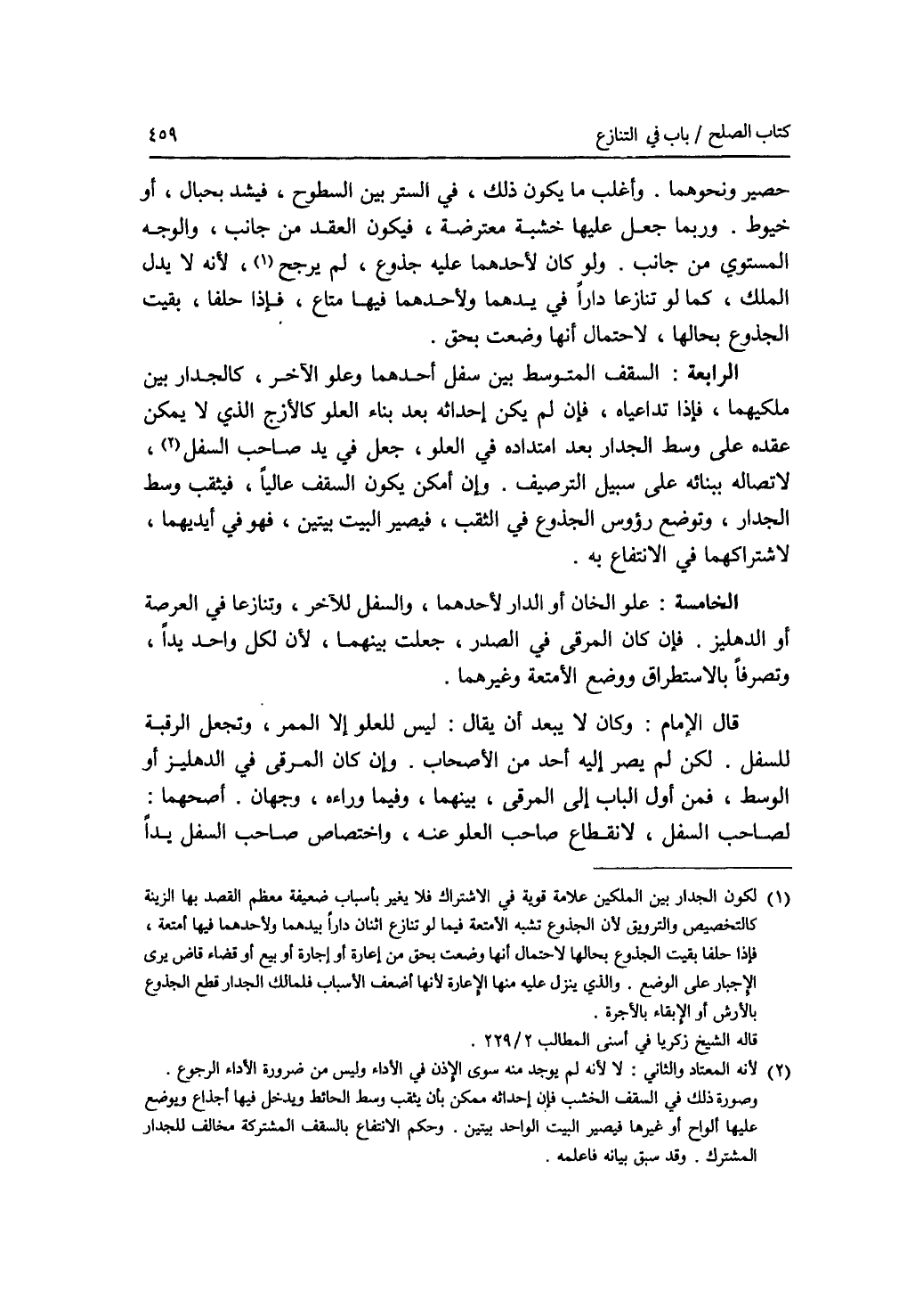 حصير ونحوهما. وأغلب ما يكون ذلك، في الستر بين السطوح، فيشد بحبال، أو خيوط. وربما جعل عليها خشبة معترضة، فيكون العقد من جانب، والوجه المستوي من جانب. ولو كان لاحدهما عليه جذوع، لم يرجح، لانه لا يدل على الملك، كما لو تنازعا دارا في يدهما ولاحدهما فيها متاع، فإذا حلفا، بقيت الجذوع بحالها، لاحتمال أنها وضعت بحق. الرابعة: السقف المتوسط بين سفل أحدهما وعلو الآخر، كالجدار بين ملكيهما، فإذا تداعياه، فإن لم يكن إحداثه بعد بناء العلو كالازج الذي لا يمكن عقده على وسط الجدار بعد امتداده في العلو، جعل في يد صاحب السفل، لاتصاله ببنائه على سبيل الترصيف. وإن أمكن بأن يكون السقف عاليا، فيثقب وسط الجدار، وتوضع رؤوس الجذوع في الثقب، فيصير البيت بيتين، فهو في أيديهما، لاشتراكهما في الانتفاع به. الخامسة: علو الخان أو الدار لاحدهما، والسفل للآخر، وتنازعا في العرصة أو الدهليز. فإن كان المرقى في الصدر، جعلت بينهما، لان لكل واحد يدا، وتصرفا بالاستطراق ووضع الامتعة وغيرهما. قال الامام: وكان لا يبعد أن يقال: ليس للعلو إلا الممر، وتجعل الرقبة للسفل. لكن لم يصر إليه أحد من الاصحاب. وإن كان المرقى في الدهليز أو الوسط، فمن أول الباب إلى المرقى، بينهما، وفيما وراءه، وجهان. أصحهما: لصاحب السفل، لانقطاع صاحب العلو عنه، واختصاص صاحب السفل يدا