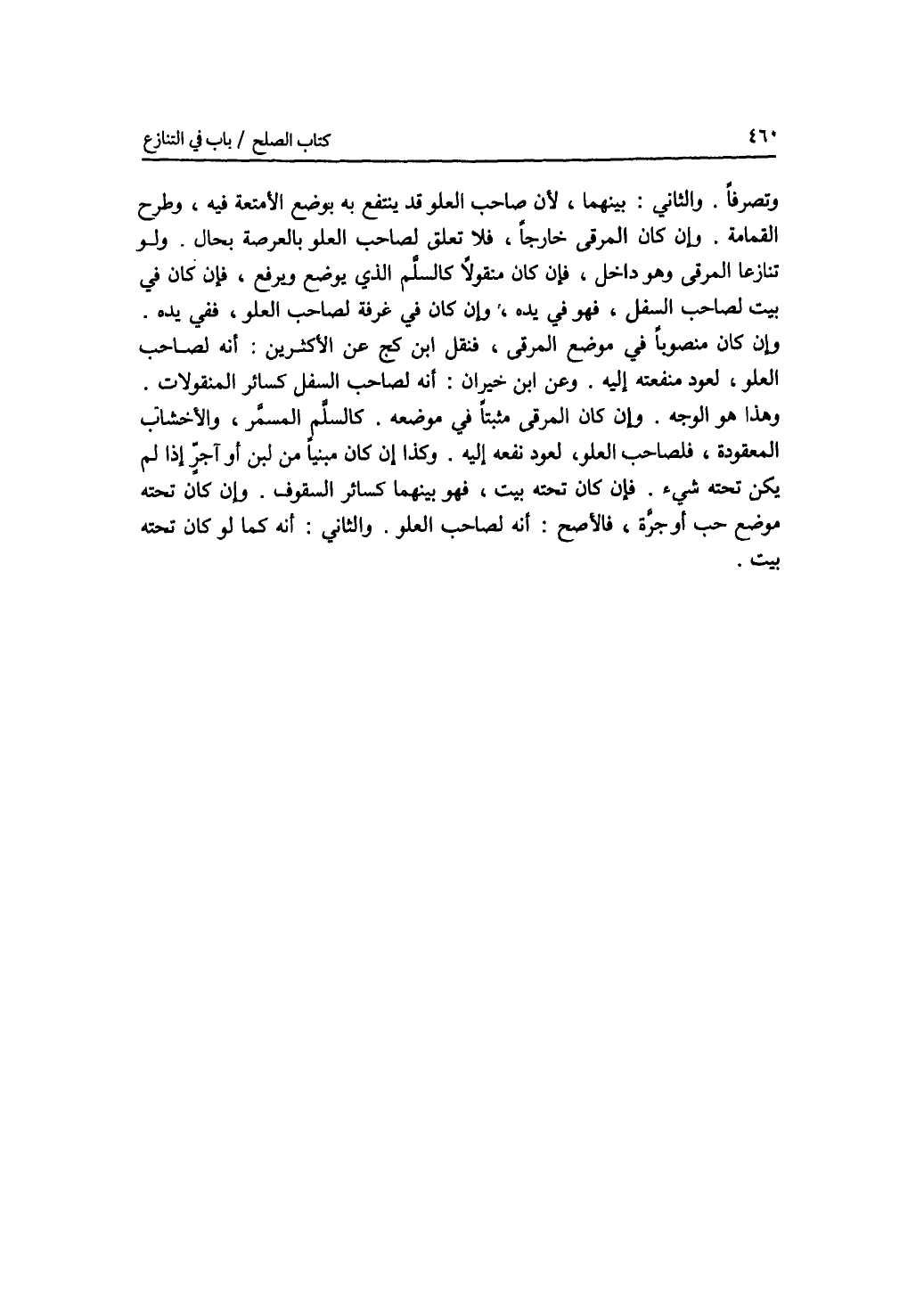 وتصرفا. والثاني: بينهما، لان صاحب العلو قد ينتفع به بوضع الامتعة فيه، وطرح القمامة. وإن كان المرقى خارجا، فلا تعلق لصاحب العلو بالعرصة بحال. ولو تنازعا المرقى وهو داخل، فإن كان منقولا كالسلم الذي يوضع ويرفع، فإن كان في بيت لصاحب السفل، فهو في يده، وإن كان في غرفة لصاحب العلو، ففي يده. وإن كان منصوبا في موضع المرقى، فنقل ابن كج عن الاكثرين: أنه لصاحب العلو، لعود منفعته إليه. وعن ابن خيران: أنه لصاحب السفل كسائر المنقولات. وهذا هو الوجه. وإن كان المرقى مثبتا في موضعه، كالسلم المسمر، والاخشاب المعقودة، فلصاحب العلو، لعود نفعه إليه. وكذا إن كان مبنيا من لبن أو آجر إذا لم يكن تحته شئ. فإن كان تحته بيت، فهو بينهما كسائر السقوف. وإن كان تحته موضع حب أو جرة، فالاصح: أنه لصاحب العلو. والثاني: أنه كما لو كان تحته بيت.