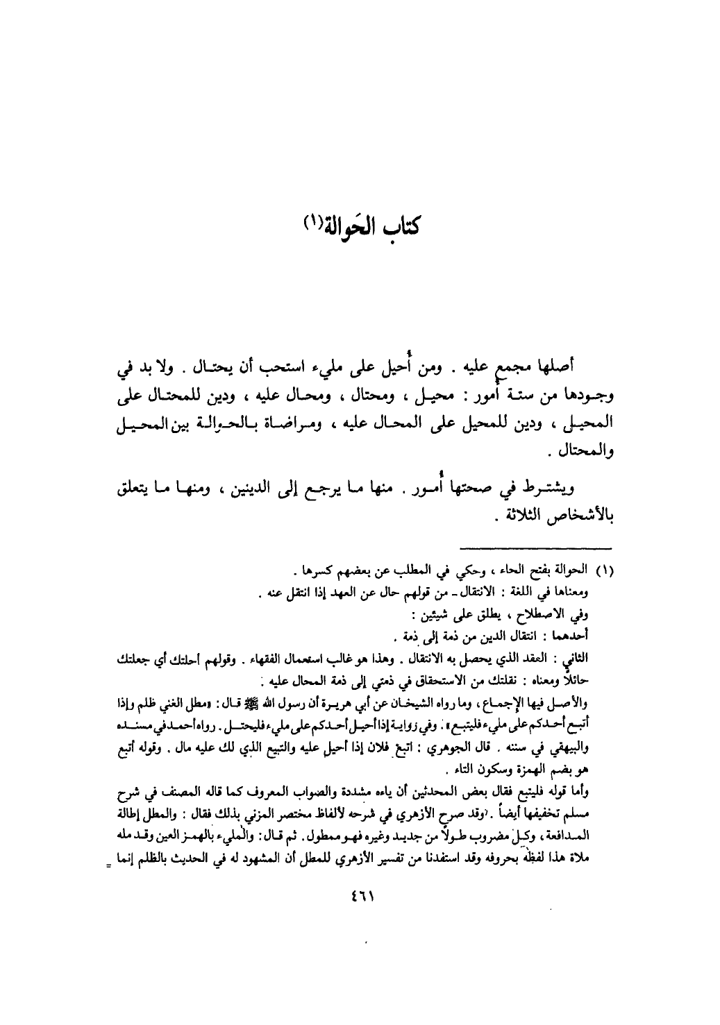 أصلها مجمع عليه. ومن أحيل على ملئ استحب أن يحتال. ولا بد في وجودها من ستة أمور: محيل، ومحتال، ومحال عليه، ودين للمحتال على المحيل، ودين للمحيل على المحال عليه، ومراضاة بالحوالة بين المحيل والمحتال. ويشترط في صحتها أمور. منها ما يرجع إلى الدينين، ومنها ما يتعلق بالاشخاص الثلاثة.