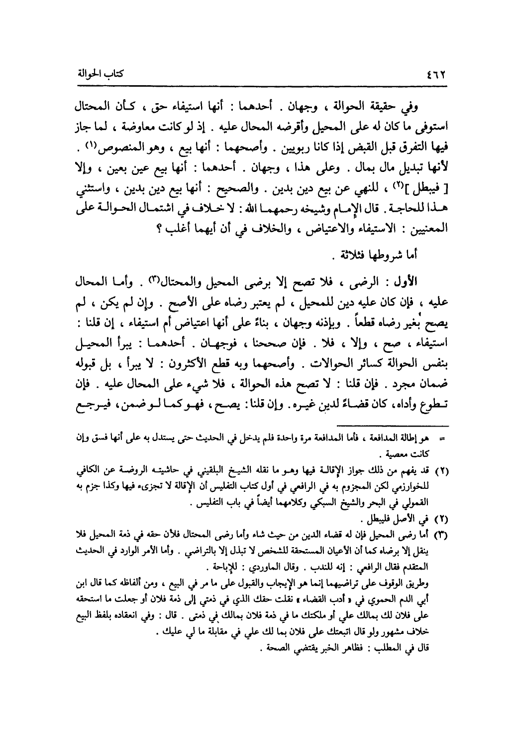 وفي حقيقة الحوالة، وجهان. أحدهما: أنها إستيفاء حق، كأن المحتال استوفى ما كان له على المحيل وأقرضه المحا عليه. إذ لو كانت معاوضة، لما جاز فيها التفرق قبل القبض إذا كانا ربويين. وأصحهما: أنها بيع، وهو المنصوص، لانها تبديل مال بمال. وعلى هذا، وجهان. أحدهما: أنها بيع عين بعين، وإلا، فيبطل، للنهي عن بيع دين بدين. والصحيح: أنها بيع دين بدين، واستثني هذا للحاجة. قال الامام وشيخه رحمهما الله: لا خلا ف في اشتمال الحوالة على المعنيين: الاستيفاء والاعتياض، والخلاف في أن أيهما أغلب ؟ أما شروطها فثلاثة. الاول: الرضى، فلا تصح إلا برضى المحيل والمحتال. وأما المحال عليه، فإن كان عليه دين للمحيل، لم يعتبر رضاه على الاصح. وإن لم يكن، لم يصح بغير رضاه قطعا. وبإذنه وجهان، بناء على أنها اعتياض أم استيفاء، إن قلنا: استيفاء، صح، وإلا، فلا. فإن صححنا، فوجهان. أحدهما: يبر المحيل بنفس الحوالة كسائر الحوالات. وأصحهما وبه قطع الاكثرون: لا يبرأ، بل قبوله ضمان مجرد. فإن قلنا: لا تصح هذه الحوالة، فلا شئ على المحال عليه. فإن تطوع وأداه، كان قضاء لدين غيره. وإن قلنا: يصح، فهو كما لو ضمن، فيرجع