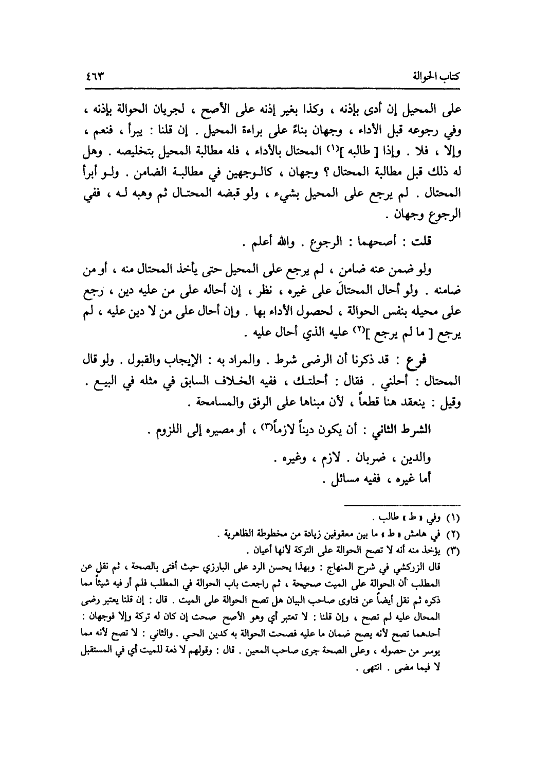 على المحيل إن أدى بإذنه، وكذا بغير إذنه على الاصح، لجريان الحوالة بإذنه، وفي رجوعه قبل الاداء، وجهان بناء على براءة المحيل. إن قلنا: يبرأ، فنعم، وإلا، فلا. وإذا طالب المحتال بالاداء، فله مطالبة المحيل بتخليصه. وهل له ذلك قبل مطالبة المحتال ؟ وجهان، كالوجهين في مطالبة الضامن. ولو أبرأ المحتال، لم يرجع على المحيل بشئ. ولو قبضه المحتال ثم وهبه له، ففي الرجوع وجهان. قلت أصحهما: الرجوع. والله أعلم. ولو ضمن عنه ضامن، لم يرجع على المحيل حتى يأخذ المحتال منه، أو من ضامنه. ولو أحال المحتال على غيره، نظر، إن أحاله على من عليه دين، رجع على محيله بنفس الحوالة، لحصول الاداء بها. وإن أحال على من لا دين عليه، لم يرجع (ما لم يرجع) عليه الذي أحال عليه.