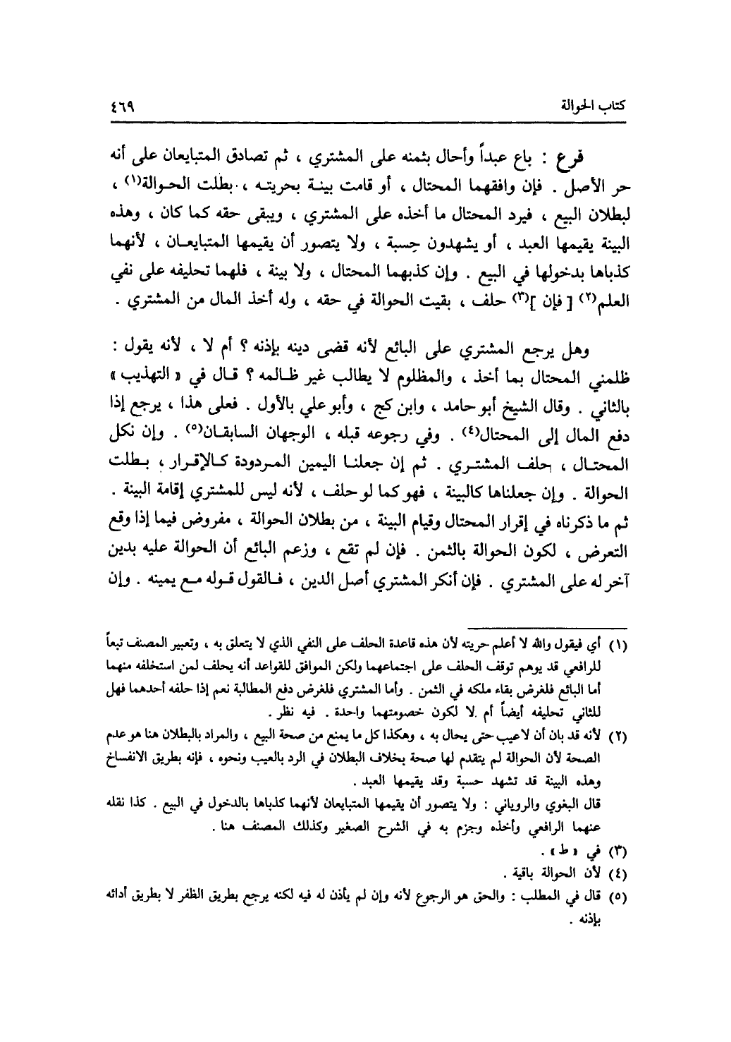 فرع باع عبدا وأحال بثمنه على المشتري، ثم تصادق المتبايعان على أنه حر الاصل. فإن وافقهما المحتال، أو قامت بينة بحريته، بطلت الحوالة، لبطلان البيع، فيرد المحتال ما أخذه على المشتري، ويبقى حقه كما كان، وهذه البينة يقيمها العبد، أو يشهدون حسبة. ولا يتصور أن يقيمها المتبايعان، لانهما كذباها بدخولهما في البيع. وإن كذبهما المحتال، ولا بينة، فلهما تحليفه على نفي العلم، فإذا حلف، بقيت الحوالة في حقه، وله أخذ المال من المشتري. وهل يرجع المشتري على البائع لانه قضى دينه بإذنه ؟ أم لا، لانه يقول: ظلمني المحتال بما أخذ، والمظلوم لا يطالب غير ظالمه ؟ قال في التهذيب بالثاني. وقال الشيخ أبو حامد، وابن كج، وأبو علي بالاول فعلى هذا، يرجع إذا دفع المال إلى المحتال. وفي رجوعه قبله، الوجهان السابقان. وإن نكل المحتال، حلف المشتري. ثم إن جعلنا اليمين المردودة كالاقرار، بطلت الحوالة. وإن جعلناها كالبينة، فهو كما لو حلف، لانه ليس للمشتري إقامة البينة. ثم ما ذكرناه في إقرار المحتال وقيام البينة، من بطلان الحوالة، مفروض فيما إذا وقع التعرض، لكون الحوالة بالثمن. فإن لم تقع، وزعم البائع أن الحوالة عليه بدين آخر له على المشتري. فإن أنكر المشتري أصل الدين، فالقول قوله مع يمينه. وإن