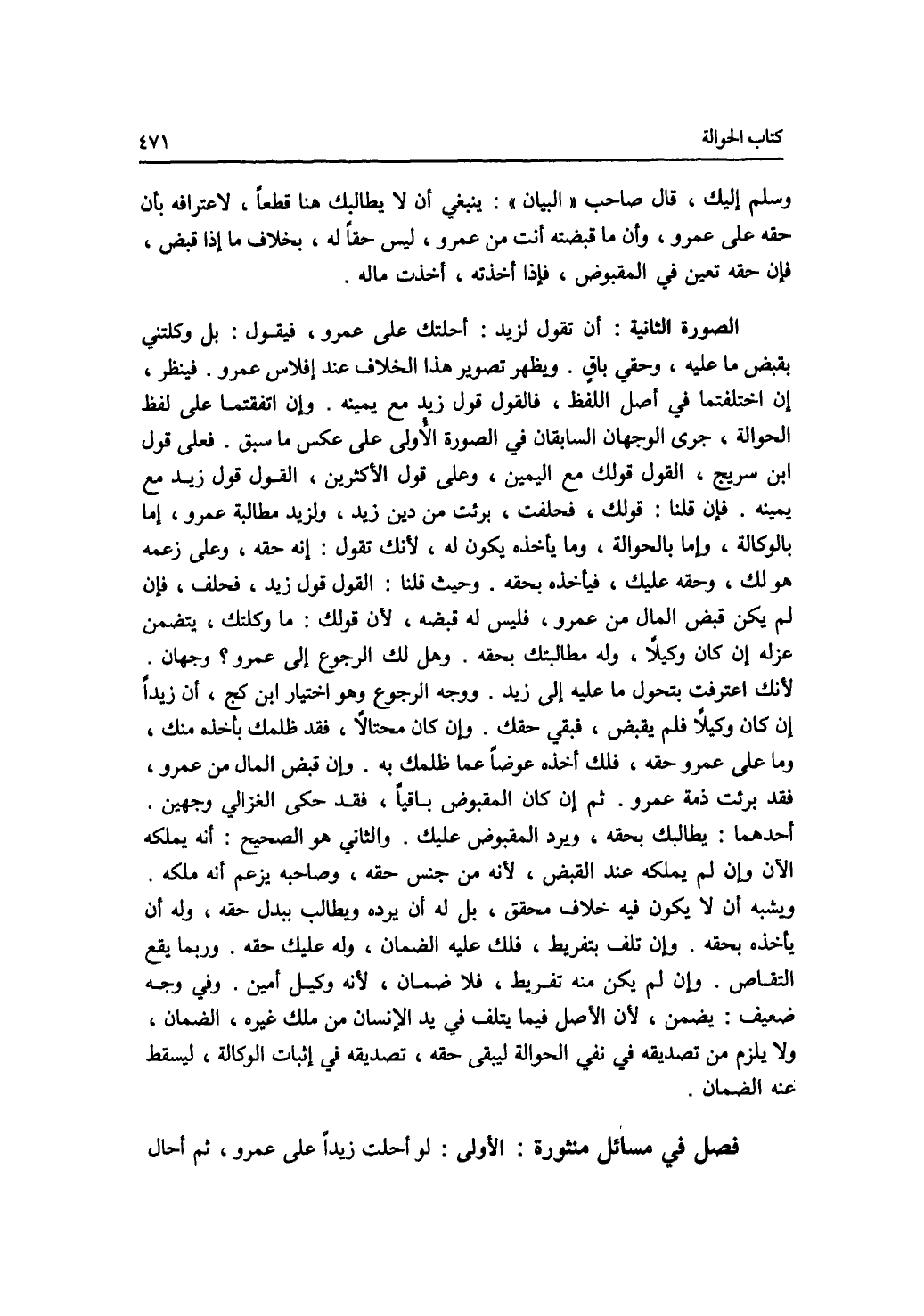 وسلم إليك، قال صاحب البيان: ينبغي أن لا يطالبك هنا قطعا، لاعترافه بأن حقه على عمرو، وأن ما قبضته أنت من عمرو، ليس حقا له، بخلاف ما إذا قبض، فإن حقه تعين في المقبوض، فإذا أخذته، أخذت ماله. الصورة الثانية: أن تقول لزيد: أحلتك على عمرو، فيقول: بل وكلتني بقبض ما عليه، وحقي باق. ويظهر تصوير هذا الخلاف عند إفلاس عمرو. فينظر، إن اختلفتما في أصل اللفظ، فالقول قول زيد مع يمينه. وإن اتفقتما على لفظ الحوالة، جرى الوجهان السابقان في الصورة الاولى على عكس ما سبق. فعلى قول ابن سريج، القول قولك، مع اليمين، وعلى قول الاكثرين، القول قول زيد مع يمينه. فإن قلنا: قولك، فحلفت، برئت من دين زيد، ولزيد مطالبة عمرو، إما بالوكالة، وإما بالحوالة، وما يأخذه يكون له، لانك تقول: إنه حقه، وعلى زعمه هو لك، وحقه عليك، فيأخذه بحقه. وحيث قلنا: القول قول زيد، فحلف، فإن لم يكن قبض المال من عمرو، فليس له قبضه، لان قولك: ما وكلتك، يتضمن عزله إن كان وكيلا، وله مطالبتك بحقه. وهل لك الرجوع إلى عمرو ؟ وجهان. لانك اعترفت بتحول ما عليه إلى زيد. ووجه الرجوع وهو اختيار ابن كج، أن زيدا إن كان وكيلا فلم يقبض، فبقي حقك. وإن كان محتالا، فقد ظلمك بأخذه منك، وما على عمرو حقه، فلك أخذه عوضا عما ظلمك به. وإن قبض المال من عمرو، فقد برئت ذمة عمرو. ثم إن كان المقبوض باقيا، فقد حكى الغزالي وجهين. أحدهما: يطالبك بحقه، ويرد المقبوض عليك. والثاني وهو الصحيح: أنه يملكه الآن وإن لم يملكه عند القبض، لانه من جنس حقه، وصاحبه يزعم أنه ملكه. ويشبه أن لا يكون فيه خلاف محقق، بل له أن يرده ويطالب ببدل حقه، وله أن يأخذه بحقه. وإن تلف بتفريط، فلك عليه الضمان، وله عليك حقه. وربما يقع التقاص. وإن لم يكن منه تفريط، فلا ضمان، لانه وكيل أمين. وفي وجه ضعيف: يضمن، لان الاصل فيما يتلف في يد الانسان من ملك غيره، الضمان، ولا يلزم من تصديقه في نفي الحوالة ليبقى حقه، تصديقه في إثبات الوكالة، ليسقط عنه الضمان. فصل في مسائل منثورة الاولى: لو أحلت زيدا على عمرو، ثم أحال