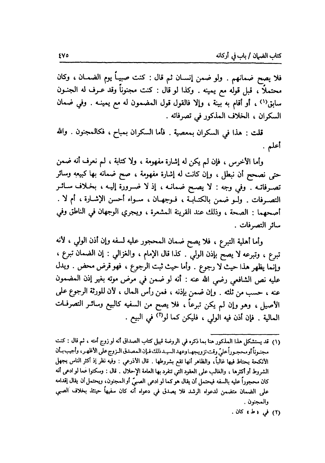 فلا يصح ضمانهم. ولو ضمن إنسان ثم قال: كنت صبيا يوم الضمان، وكان محتملا، قبل قوله مع يمينه. وكذا لو قال: كنت مجنونا وقد عرف له جنون سابق، أو أقام به بينة، وإلا فالقول قول المضمون له مع يمينه. وفي ضمان السكران، الخلاف المذكور في تصرفاته. قلت: هذا في السكران بمعصية. فأما السكران بمباح، فكالمجنون. والله أعلم. وأما الاخرس، فإن لم يكن له إشارة مفهومة، ولا كتابة، لم نعرف أنه ضمن حتى نصحح أو نبطل، وإن كانت له إشارة مفهومة، صح ضمانه بها كبيعه وسائر تصرفاته. وفي وجه: لا يصح ضمانه، إذ لا ضرورة إليه، بخلاف سائر التصرفات. ولو ضمن بالكتابة، فوجهان، سواء أحسن الاشارة، أم لا. أصحهما: الصحة، وذلك عند القرينة المشعرة، ويجري الوجهان في الناطق وفي سائر التصرفات. وأما أهلية التبرع، فلا يصح ضمان المحجور عليه لسفه وإن أذن الولي، لانه تبرع، وتبرعه لا يصح بإذن الولي. كذا قال الامام، والغزالي: إن الضمان تبرع، وإنما يظهر هذا حيث لا رجوع. وأما حيث ثبت الرجوع، فهو قرض محض. ويدل عليه نص الشافعي رضي الله عنه: أنه لو ضمن في مرض موته بغير إذن المضمون عنه، حسب من ثلثه. وإن ضمن باذنه، فمن رأس المال، لان للورثة الرجوع على الاصيل، وهو وإن لم يكن تبرعا فلا يصح من السفيه كالبيع وسائر التصرفات المالية. فان أذن فيه الولي، فليكن كما لو كان في البيع.