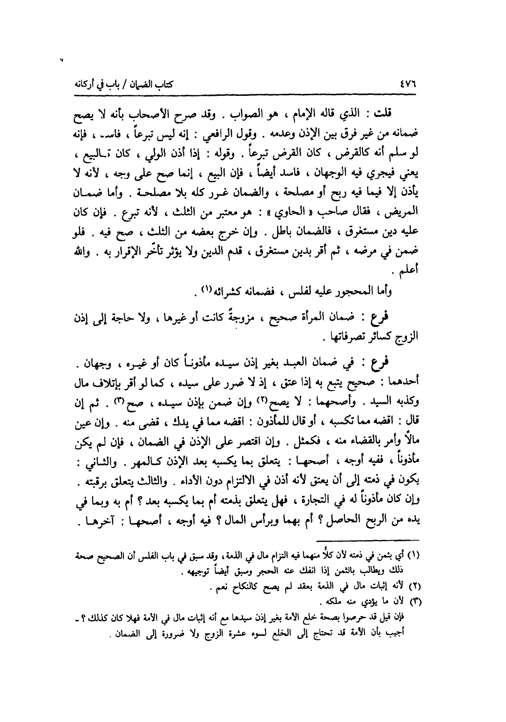 قلت: الذي قاله الامام، هو الصواب. وقد صرح الاصحاب بأنه لا يصح ضمانه من غير فرق بين الاذن وعدمه. وقول الرافعي: إنه ليس تبرعا، فاسد، فإنه لو سلم أنه كالقرض، كان القرض تبرعا. وقوله: إذا أذن الولي، كان كالبيع، يعني فيجري فيه الوجهان، فاسد أيضا، فان البيع، إنما صح على وجه، لانه لا يأذن إلا فيما فيه ربح أو مصلحة، والضمان غرر كله بلا مصلحة. وأما ضمان المريض، فقال صاحب الحاوي: هو معتبر من الثلث، لانه تبرع. فان كان عليه دين مستغرق، فالضمان باطل. وإن خرج بعضه من الثلث، صح فيه. فلو ضمن في مرضه، ثم أقر بدين مستغرق، قدم الدين ولا يؤثر تأخر الاقرار به. والله أعلم. وأما المحجور عليه لفلس، فضمانه كشرائه. فرع ضمان المرأة صحيح، مزوجة كانت أو غيرها، ولا حاجة إلى إذن الزوج كسائر تصرفاتها. فرع في ضمان العبد بغير إذن سيده مأذونا كان أو غيره، وجهان. أحدهما: صحيح يتبع به إذا عتق، إذ لا ضرر على سيده، كما لو أقر باتلاف مال وكذبه السيد. وأصحهما: لا يصح. وإن ضمن بإذن سيده، صح. ثم إن قال: اقضه مما تكسبه، أو قال للمأذون: اقضه مما في يدك، قضى منه. وإن عين مالا وأمر بالقضاء منه، فكمثل. وإن اقتصر على الاذن في الضمان، فإن لم يكن مأذونا، ففيه أوجه، أصحها: يتعلق بما يكسبه بعد الاذن كالمهر. والثاني: يكون في ذمته إلى أن يعتق لانه أذن في الالتزام دون الاداء. والثالث يتعلق برقبته. وإن كان مأذونا له في التجارة، فهل يتعلق بذمته أم بما يكسبه بعد ؟ أم به وبما في يده من الربح الحاصل ؟ أم بهما وبرأس المال ؟ فيه أوجه، أصحها: آخرها.
