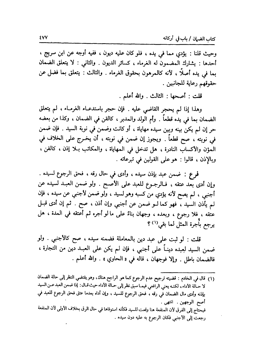 وحيث قلنا: يؤدي مما في يده، فلو كان عليه ديون، ففيه أوجه عن ابن سريج، أحدها: يشارك المضمون له الغرماء، كسائر الديون. والثاني: لا يتعلق الضمان بما في يده أصلا، لانه كالمرهون بحقوق الغرماء. والثالث: يتعلق بما فضل عن حقوقهم رعاية للجانبين. قلت: أصحها: الثالث. والله أعلم. وهذا إذا لم يحجر القاضي عليه. فإن حجر باستدعاء الغرماء، لم يتعلق الضمان بما في يده قطعا. وأم الولد والمدبر، كالقن في الضمان، وكذا من بعضه حر إن لم يكن بينه وبين سيده مهاياة، أو كانت وضمن في نوبة السيد. فإن ضمن في نوبته، صح قطعا. ويجوز إن ضمن في نوبته، أن يخرج على الخلاف في المؤن والاكساب النادرة، هل تدخل في المهاياة ؟ والمكاتب بلا إذن، كالقن، وبالاذن، قالوا: هو على القولين في تبرعاته. فرع ضمن عبد باذن سيده، وأدى في حال رقه، فحق الرجوع لسيده. وإن أدى بعد عتقه، فالرجوع للعبد على الاصح. ولو ضمن العبد لسيده عن أجنبي، لم يصح لانه يؤدي من كسبه وهو لسيده، ولو ضمن لاجنبي عن سيده، فإن لم يأذن السيد، فهو كما لو ضمن عن أجنبي. وإن أذن، صح. ثم إن أدى قبل عتقه، فلا رجوع، وبعده، وجهان بناء على ما لو أجره ثم أعتقه في المدة، هل يرجع بأجرة المثل لما بقي ؟ قلت: لو ثبت على عبد دين بالمعاملة فضمنه سيده، صح كالاجنبي. ولو ضمن السيد لعبده دينا على أجنبي، فإن لم يكن على العبد دين من التجارة، فالضمان باطل. وإلا فوجهان، قاله في الحاوي. والله أعلم.