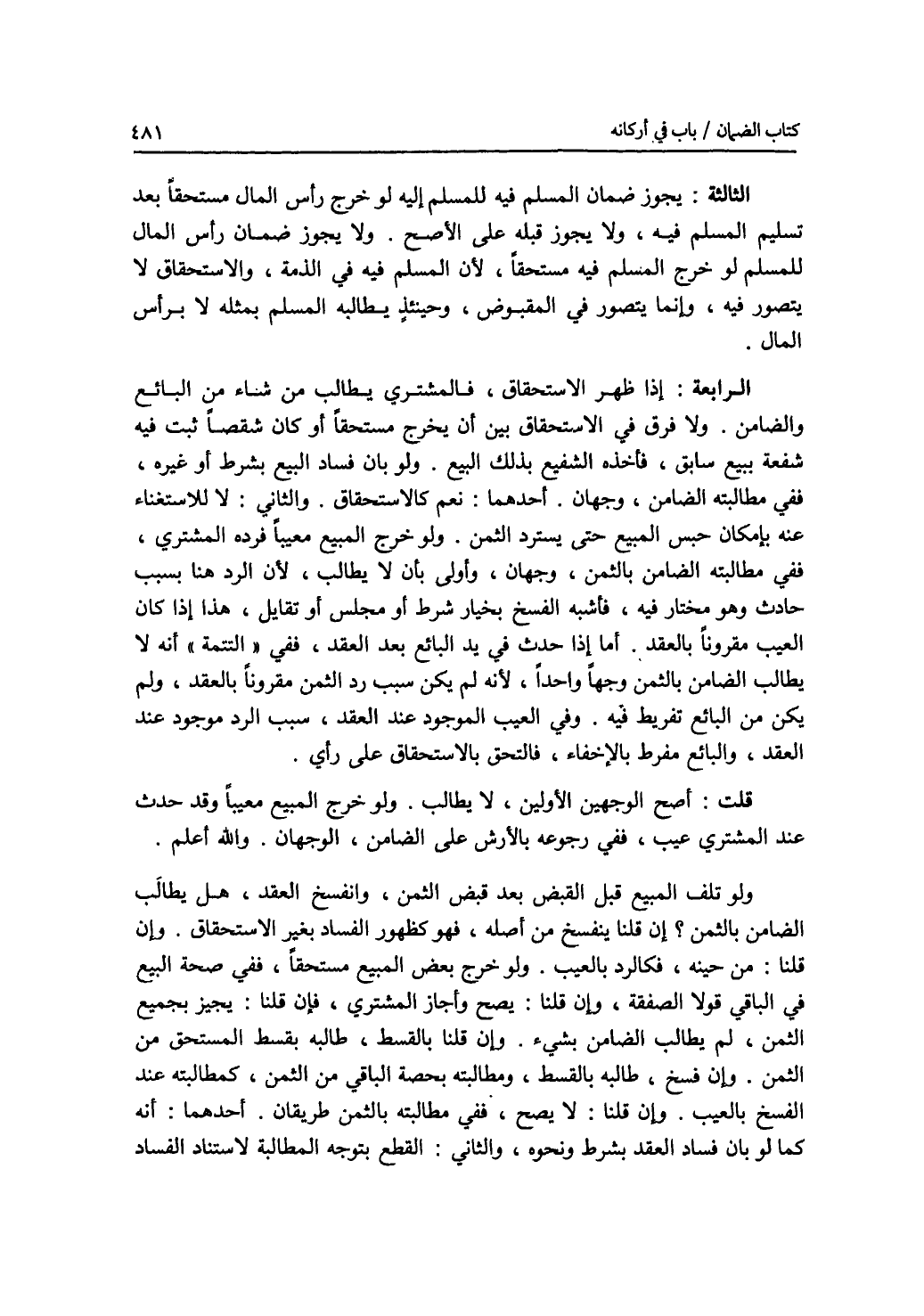 الثالثة يجوز ضمان المسلم فيه للمسلم إليه لو خرج رأس المال مستحقا بعد تسليم المسلم فيه، ولا يجوز قبله على الاصح. ولا يجوز ضمان رأس المال للمسلم لو خرج المسلم فيه مستحقا، لان المسلم فيه في الذمة، والاستحقاق لا يتصور فيه، وإنما يتصور في المقبوض، وحينئذ يطالبه المسلم بمثله لا برأس المال. الرابعة: إذا ظهر الاستحقاق، فالمشتري يطالب من شاء من البائع والضامن. ولا فرق في الاستحقاق بين أن يخرج مستحقا أو كان شقصا ثبت فيه شفعة ببيع سابق، فأخذه الشفيع بذلك البيع، ولو بان فساد البيع بشرط أو غيره، ففي مطالبته الضامن، وجهان. أحدهما: نعم كالاستحقاق. والثاني: لا للاستغناء عنه بامكان حبس المبيع حتى يسترد الثمن. ولو خرج المبيع معيبا فرده المشتري، ففي مطالبته الضامن بالثمن، وجهان، وأولى بأن لا يطالب، لان الرد هنا بسبب حادث وهو مختار فيه، فأشبه الفسخ بخيار شرط أو مجلس أو تقايل، هذا إذا كان العيب مقرونا بالعقد. أما إذا حدث في يد البائع بعد العقد، ففي التتمة أنه لا يطالب الضامن بالثمن وجها واحدا، لانه لم يكن سبب رد الثمن مقرونا بالعقد، ولم يكن من البائع تفريط فيه. وفي العيب الموجود عند العقد، سبب الرد موجود عند العقد، والبائع مفرط بالاخفاء، فالتحق بالاستحقاق على رأي. قلت: أصح الوجهين الاولين، لا يطالب. ولو خرج المبيع معيبا وقد حدث عند المشتري عيب، ففي رجوعه بالارش على الضامن، الوجهان. والله أعلم. ولو تلف المبيع قبل القبض بعد قبض الثمن، وانفسخ العقد، هل يطالب الضامن بالثمن ؟ إن قلنا ينفسخ من أصله، فهو كظهور الفساد بغير الاستحقاق. وإن قلنا: من حينه، فكالرد بالعيب. ولو خرج بعض المبيع مستحقا، ففي صحة البيع في الباقي قولا الصفقة، وإن قلنا: يصح وأجاز المشتري، فإن قلنا: يجيز بجميع الثمن، لم يطالب الضامن بشئ. وإن قلنا: بالقسط، طالبه بقسط المستحق من الثمن. وإن فسخ، طالبه بالقسط، ومطالبته بحصة الباقي من الثمن، كمطالبته عند الفسخ بالعيب. وإن قلنا: لا يصح ففي مطالبته بالثمن طريقان. أحدهما: أنه كما لو بان فساد العقد بشرط ونحوه، والثاني: القطع بتوجه المطالبة لاستناد الفساد