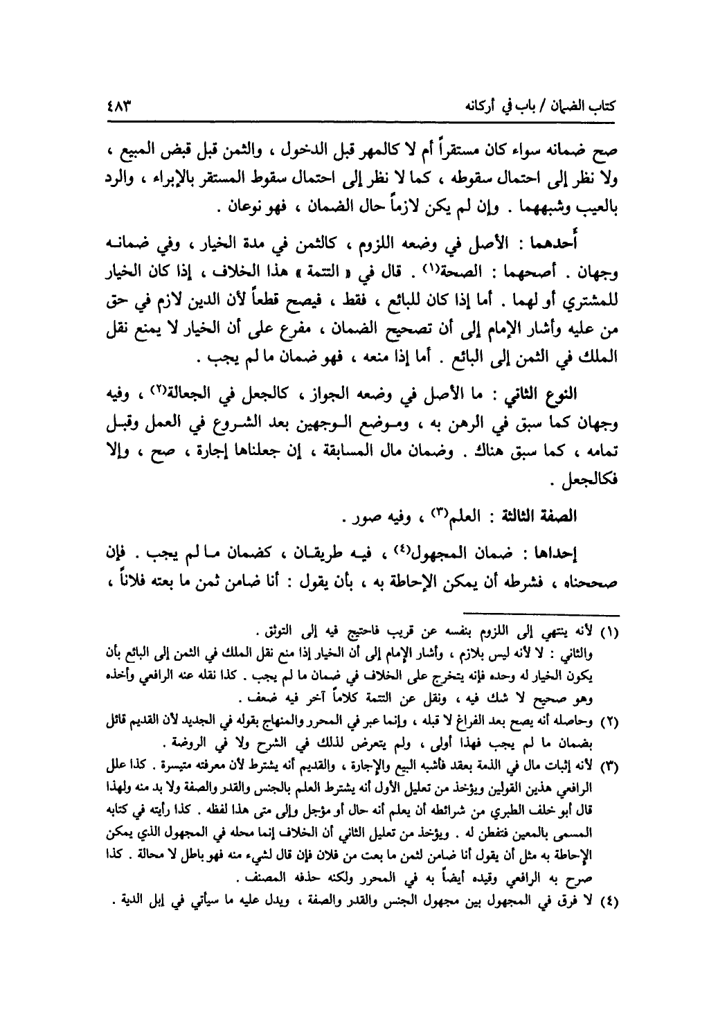 صح ضمانه سواء كان مستقرا أم لا كالمهر قبل الدخول، والثمن قبل قبض المبيع، ولا نظر إلى احتمال سقوطه، كما لا نظر إلى احتمال سقوط المستقر بالابراء، والرد بالعيب وشبههما. وإن لم يكن لازما حال الضمان، فهو نوعان. أحدهما: الاصل في وضعه اللزوم، كالثمن في مدة الخيار، وفي ضمانه وجهان. أصحهما: الصحة. قال في التتمة هذا الخلاف، إذا كان الخيار للمشتري أو لهما. أما إذا كان للبائع، فقط، فيصح قطعا لان الدين لازم في حق من عليه. وأشار الامام إلى أن تصحيح الضمان، مفرع على أن الخيار لا يمنع نقل الملك في الثمن إلى البائع. أما إذا منعه، فهو ضمان ما لم يجب. النوع الثاني: ما الاصل في وضعه الجواز، كالجعل في الجعالة، وفيه وجهان كما سبق في الرهن به، وموضع الوجهين بعد الشروع في العمل وقبل تمامه، كما سبق هناك. وضمان مال المسابقة، إن جعلناها إجارة، صح، وإلا فكالجعل. الصفة الثالثة: العلم، وفيه صور. احداها: ضمان المجهول، فيه طريقان، كضمان ما لم يجب. فان صححناه، فشرطه أن يمكن الاحاطة به، بأن يقول: أنا ضامن ثمن ما بعته فلانا،