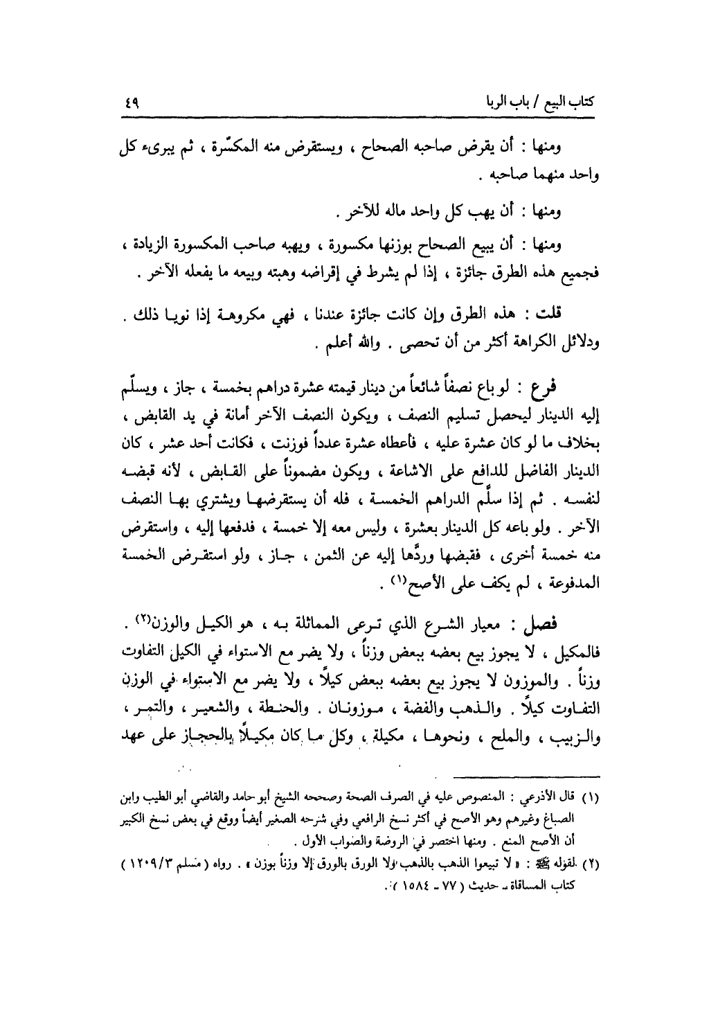 ومنها: أن يقرض صاحبه الصحاح، ويستقرض منه المكسرة، ثم يبرئ كل واحد منهما صاحبه. ومنها: أن يهب كل واحد ماله للآخر. ومنها: أن يبيع الصحاح بوزنها مكسورة، ويهبه صاحب المكسورة الزيادة، فجميع هذه الطرق جائزة، إذا لم يشرط في إقراضه وهبته وبيعه ما يفعله الآخر. قلت: هذه الطرق وإن كانت جائزة عندنا، فهي مكروهة إذا نويا ذلك. ودلائل الكراهة أكثر من أن تحصى. والله أعلم. فرع لو باع نصفا شائعا من دينار قيمته عشرة دراهم بخمسة، جاز، ويسلم إليه الدينار ليحصل تسليم النصف، ويكون النصف الآخر أمانة في يد القابض، بخلاف ما لو كان له عشرة عليه، فأعطاه عشرة عددا فوزنت، فكانت أحد عشر، كان الدينار الفاضل للدافع على الاشاعة، ويكون مضمونا على القابض، لانه قبضه لنفسه. ثم إذا سلم الدراهم الخمسة، فله أن يستقرضها ويشتري بها النصب الآخر. ولو باعه كل الدينار بعشرة، وليس معه إلا خمسة، فدفعها إليه، واستقرض منه خمسة أخرى، فقبضها وردها إليه عن الثمن، جاز، ولو استقرض الخمسة المدفوعة، لم يكف على الاصح.