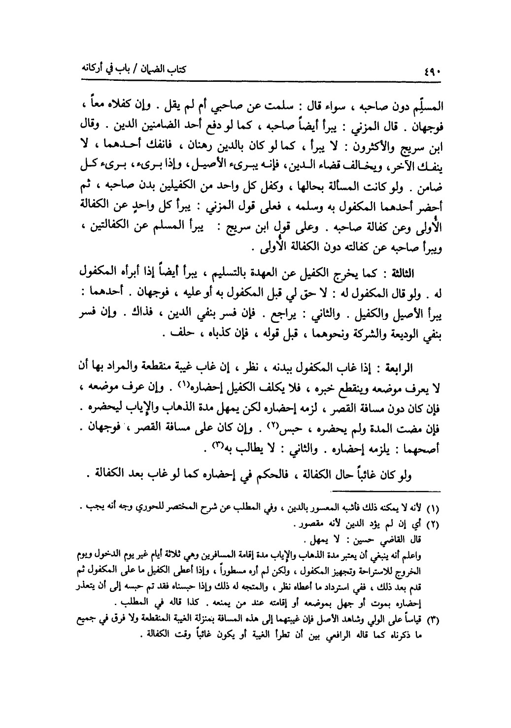 المسلم دون صاحبه، سواء قال: سلمت عن صاحبي أم لم يقل. وإن كفلاه معا، فوجهان. قال المزني: يبرأ أيضا صاحبه، كما لو دفع أحد الضامنين الدين. وقال ابن سريج والاكثرون: لا يبرأ، كما لو كان بالدين رهنان، فانفك أحدهما، لا ينفك الآخر، ويخالف قضاء الدين، فإنه يبرئ الاصيل، وإذا برئ، برئ كل ضامن. ولو كانت المسألة بحالها، وكفل كل واحد من الكفيلين بدن صاحبه، ثم أحضر أحدهما المكفول به وسلمه، فعلى قول المزني: يبرأ كل واحد عن الكفالة الاولى وعن كفالة صاحبه. وعلى قول ابن سريج: يبرأ المسلم عن الكفالتين، ويبرأ صاحبه عن كفالته دون الكفالة الاولى. الثالثة: كما يخرج الكفيل عن العهدة بالتسليم، يبرأ أيضا إذا أبرأه المكفول له. ولو قال المكفول له: لا حق لي قبل المكفول به أو عليه، فوجهان. أحدهما: يبرأ الاصيل والكفيل. والثاني: يرجع. فإن فسر بنفي الدين، فذاك. وإن فسر بنفي الوديعة والشركة ونحوهما، قبل قوله، فإن كذباه، حلف. الرابعة: إذا غاب المكفول ببدنه، نظر، إن غاب غيبة منقطعة والمراد بها أن لا يعرف موضعه وينقطع خبره، فلا يكلف الكفيل إحضاره. وإن عرف موضعه، فإن كان دون مسافة القصر، لزمه إحضاره لكن يمهل مدة الذهاب والاياب ليحضره. فإن مضت المدة ولم يحضره، حبس. وإن كان على مسافة القصر، فوجهان. أصحهما: يلزمه إحضاره. والثاني: لا يطالب به. ولو كان غائبا حال الكفالة، فالحكم في إحضاره كما لو غاب بعد الكفالة.