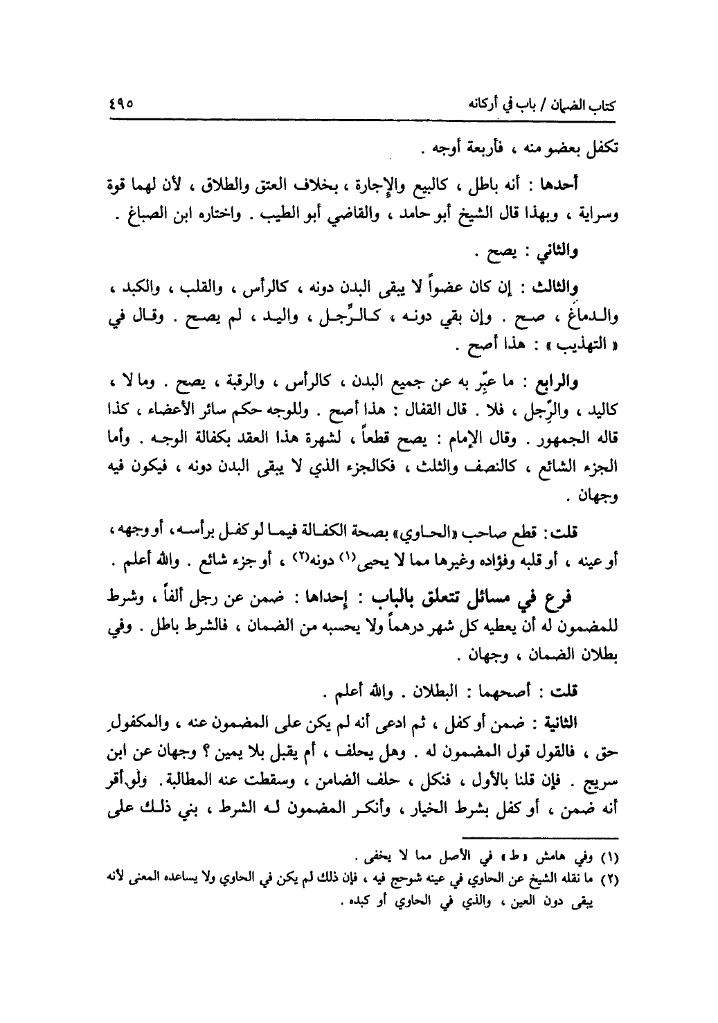 تكفل بعضو منه، فأربعة أوجه. أحدها: أنه باطل، كالبيع والاجارة، بخلاف العتق والطلاق، لان لهما قوة وسراية، وبهذا قال الشيخ أبو حامد، والقاضي أبو الطيب. واختاره ابن الصباغ. الثاني: يصح. والثالث: إن كان عضوا لا يبقى البدن دونه، كالرأس، والقلب، والكبد، والدماغ، صح. وإن بقي دونه، كالرجل، واليد، لم يصح. وقال في التهذيب: هذا أصح. والرابع: ما عبر به عن جميع البدن، كالرأس، والرقبة، يصح. وما لا، كاليد، والرجل، فلا. قال القفال: هذا أصح. وللوجه حكم سائر الاعضاء، كذا قاله الجمهور. وقال الامام: يصح قطعا، لشهرة هذا العقد بكفالة الوجه. وأما ا لجزء الشائع، كالنصف والثلث، فكالجزء الذي لا يبقى البدن دونه، فيكون فيه وجهان. قلت: قطع صاحب الحاوي بصحة الكفالة فيما لو كفل برأسه، أو وجهه، أو عينه، أو قلبه وفؤاده وغيرها مما لا يحيى دونه، أو جزء شائع. والله أعلم. فرع في مسائل تتعلق بالباب إحداها: ضمن عن رجل ألفا، وشرط للمضمون له أن يعطيه كل شهر درهما ولا يحسبه من الضمان، فالشرط باطل. وفي بطلان الضمان، وجهان. قلت: أصحهما: البطلان. والله أعلم. الثانية: ضمن أو كفل، ثم ادعى أنه لم يكن على المضمون عنه، والمكفول حق، فالقول قول المضمون له. وهل يحلف، أم يقبل بلا يمين ؟ وجهان عن ابن سريج. فإن قلنا بالاول، فنكل، حلف الضامن، وسقطت عنه المطالبة. ولو أقر أنه ضمن، أو كفل بشرط الخيار، وأنكر المضمون له الشرط، بني ذلك على