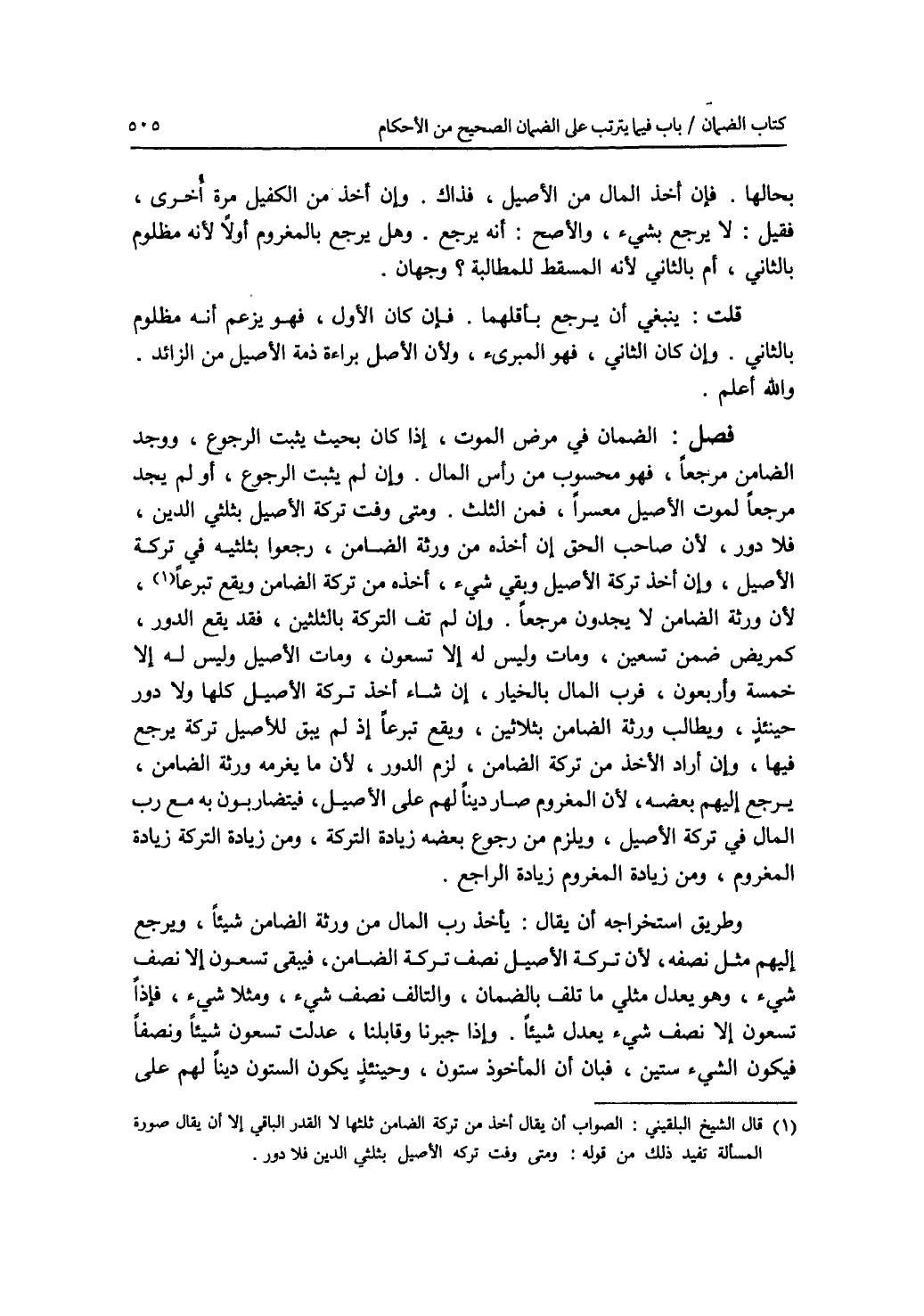 فصل الضمان في مرض الموت، إذا كان بحيث يثبت الرجوع، ووجد الضامن مرجعا، فهو محسوب من رأس المال. وإن لم يثبت الرجوع، أو لم يجد مرجعا لموت الاصيل معسرا، فمن الثلث. ومتى وفت تركة الاصيل بثلثي الدين، فلا دور، لان صاحب الحق إن أخذه من ورثة الضامن، رجعوا بثلثيه في تركة الاصيل. وإن أخذ تركة الاصيل وبقي شئ، أخذه من تركة الضامن ويقع تبرعا، لان ورثة الضامن لا يجدون مرجعا. وإن لم تف التركة بالثلثين، فقد يقع الدور، كمريض ضمن تسعين، ومات وليس له إلا تسعون، ومات الاصيل وليس له إلا خمسة وأربعون، فرب المال بالخيار، إن شاء أخذ تركة الاصيل كلها ولا دور حينئذ، ويطالب ورثة الضامن بثلاثين، ويقع تبرعا إذ لم يبق للاصيل تركة يرجع فيها، وإن أراد الاخذ من تركة الضامن، لزم الدور، لان ما يغرمه ورثة الضامن، يرجع إليهم بعضه، لان المغروم صار دينا لهم على الاصيل، فيتضاربون به مع رب المال في تركة الاصيل، ويلزم من رجوع بعضه زيادة التركة ومن زيادة التركة زيادة المغروم، ومن زيادة المغروم زيادة الراجع. وطريق استخراجه أن يقال: يأخذ رب المال من ورثة الضامن شيئا، ويرجع إليهم مثل نصفه، لان تركة الاصيل نصف تركة الضامن، فيبقى عندهم تسعون إلا نصف شئ، وهو يعدل مثلي ما تلف بالضمان، والتالف نصف شئ، ومثلا شئ، فإذا تسعون إلا نصف شئ يعدل شيئا. وإذا جبرنا وقابلنا، عدلت تسعون شيئا ونصفا فيكون الشئ ستين، فبان أن المأخوذ ستون، وحينئذ يكون الستون دينا لهم على