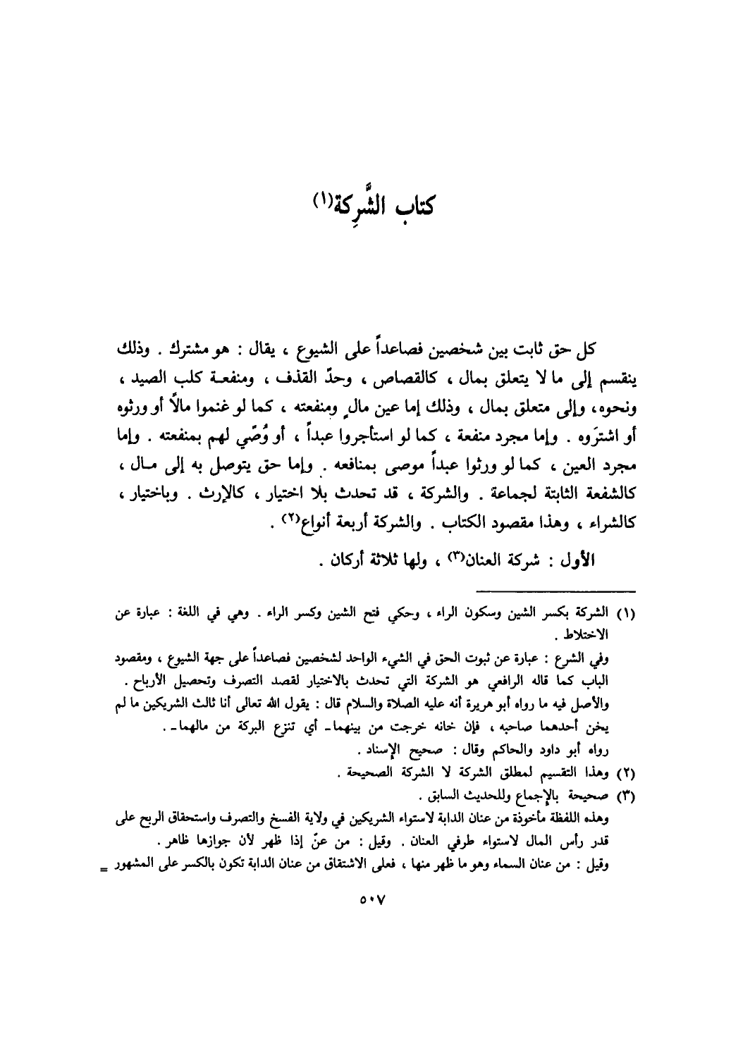 كل حق ثابت بين شخصين فصاعدا على الشيوع، يقال: هو مشترك وذلك ينقسم إلى ما لا يتعلق بمال، كالقصاص، وحد القذف، ومنفعة كلب الصيد، ونحوه، وإلى متعلق بمال، وذلك إما عين مال ومنفعته، كما لو غنموا مالا أو ورثوه أو اشتروه. وإما مجرد منفعة، كما لو استأجروا عبدا، أو وصي لهم بمنفعته. وإما مجرد العين، كما لو ورثوا عبدا موصى بمنافعه. وإما حق يتوصل به إلى مال، كالشفعة الثابتة لجماعة. والشركة، قد تحدث بلا اختيار، كالارث. وباختيار، كالشراء، وهذا مقصود الكتاب. والشركة أربعة أنواع. الاول: شركة العنان، ولها ثلاثة أركان. وفيه خلاف يأتي إن شاء الله تعالى في كتاب الغصب. فإن جعلناه متقوما، لم تجز الشركة. وإلا، فعلى الخلاف في المثلي. وأما الدراهم المغشوشة، فقال الرويانى: لا تصح الشركة فيها. وحكى في التتمة في صحة القراض عليها، خلافا مبنيا على جواز المعاملة بها، إن جوزناها، فقد ألحقنا المغشوش بالخالص، وإلا، فلا. فإذا جاء في القراض خلاف، ففي الشركة أولى. وقال صاحب العدة: الفتوى، جواز الشركة فيها إن استمر في البلد رواجها. قلت: هذا المنقول عن العدة هو الاصح. وأما قوله: أطلقوا منع الشركة في التبر إلى آخره، فعجب، فإن صاحب التتمة حكى في انعقاد الشركة على التبر والنقرة وجهين كالمثلي. والمراد بصاحب العدة هنا، أبو المكارم الروياني. والله أعلم. ثم ما ذكرناه في المسألة من منع الشركة وجوازها، المراد به: إذا أخرج هذا قدرا من ماله، وذاك قدرا، وجعلاهما رأس مال. وتتصور الشركة على غير هذا الوجه في جميع الاموال، كما سنذكره إن شاء الله تعالى. المسألة الثانية: إذا أخرج كل واحد قدرا من المال الذي تجوز الشركة فيه، وأراد الشركة، اشترط خلط المالين خلطا لا يمكن معه التمييز. فإن لم يفعلا، فتلف مال أحدهما قبل التصرف، تلف على صاحبه فقط، وتعذر إثبات الشركة في الباقي، فلا تصح الشركة إن اختلف الجنس كالدراهم والدنانير، أو الصفة كاختلاف السكة، وكالصحاح والمكسرة، أو المثقوبة، وكالعتيقة والجديدة، والبيضاء
