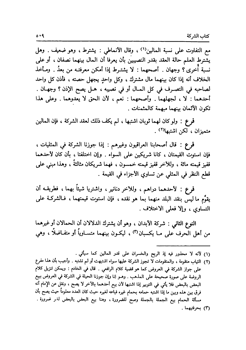 مع التفاوت على نسبة المالين، وقال الانماطي: يشترط، وهو ضعيف. وهل يشترط العلم حالة العقد بقدر النصيبين بأن يعرفا أن المال بينهما نصفان، أو على نسبة أخرى ؟ وجهان. أصحهما: لا يشترط إذا أمكن معرفته من بعد. ومأخذ الخلاف أنه إذا كان بينهما مال مشتر ك، وكل واحد يجهل حصته، فاذن كل واحد لصاحبه في التصرف في كل المال أو في نصيب، هل يصح الاذن ؟ وجهان. أحدهما: لا، لجهلهما. وأصحهما: نعم، لان الحق لا يعدوهما. وعلى هذا تكون الاثمان بينهما مبهمة كالمثمنات. فرع لو كان لهما ثوبان اشتبها، لم يكف ذلك لعقد الشركة، فان المالين متميزان، لكن اشتبها. فرع قال أصحابنا العراقيون وغيرهم: إذا جوزنا الشركة في المثليات، فإن استوت القيمتان، كانا شريكين على السواء. وإن اختلفتا، بأن كان لاحدهما قفيز قيمته مائة، وللآخر قفيز بقيمة خمسون، فهما شريكان مثالثة، وهذا مبني على قطع النظر في المثلي عن تساوي الاجزاء في القيمة. فرع لاحدهما دراهم، وللآخر دنانير، واشتريا شيئا بهما، فطريقه أن يقوم ما ليس بنقد البلد منهما بما هو نقده، فان استوت قيمتهما، فالشركة على التساوي، وإلا فعلى الاختلاف. النوع الثاني: يكسبان، ليكون بينهما متساويا أو متفاضلا، وهي