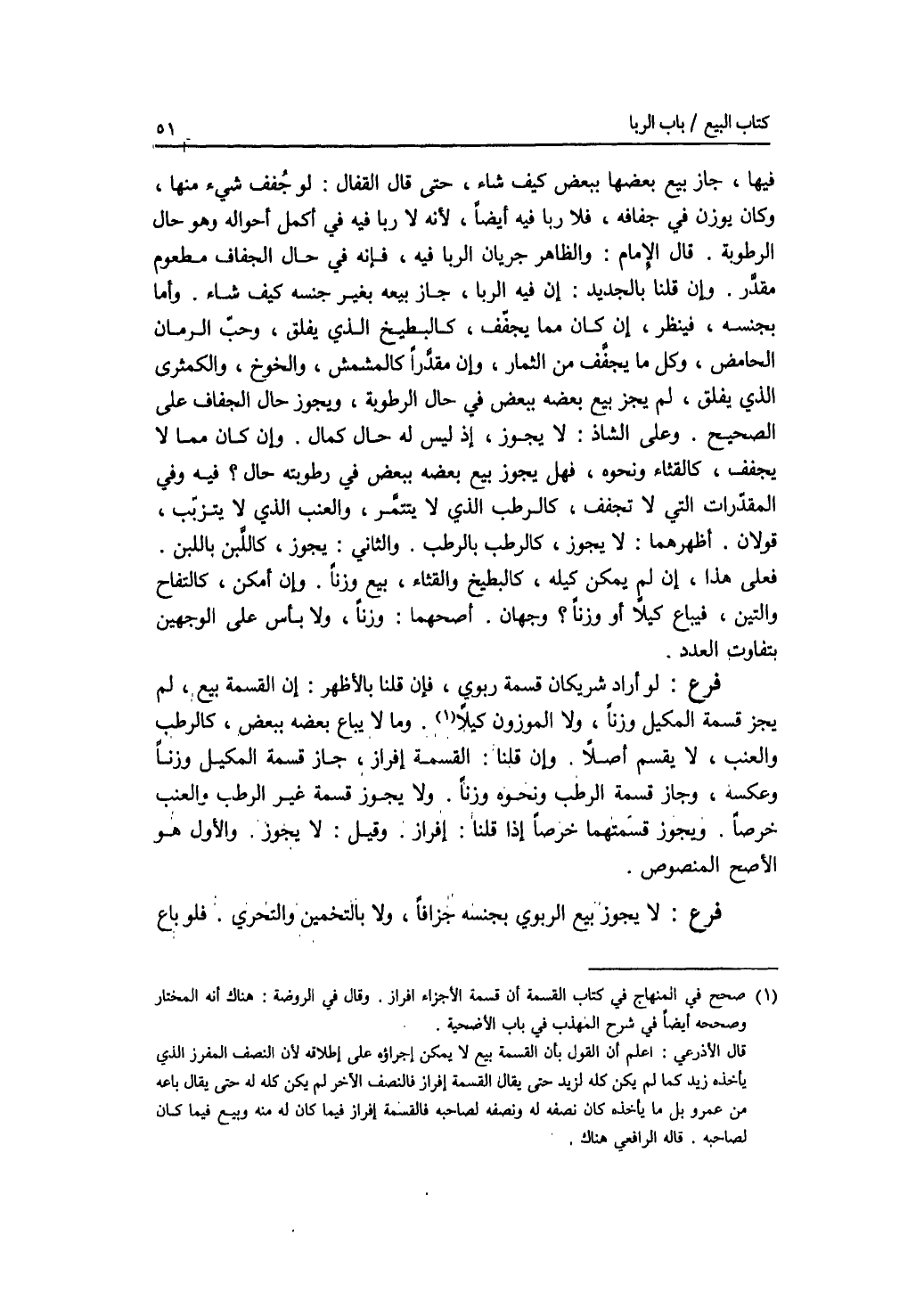 فيها، جاز بيع بعضها ببعض كيف شاء، حتى قال القفال: لو جفف شئ منها، وكان يوزن في جفافه، فلا ربا فيه أيضا، لانه لا ربا فيه في أكمل أحواله وهو حال الرطوبة. قال الامام: والظاهر جريان الربا فيه، فإنه في حال الجفاف مطعوم مقدر. وإن قلنا بالجديد: إن فيه الربا، جاز بيعه بغير جنسه كيف شاء. وأما بجنسه، فينظر، إن كان مما يجفف، كالبطيخ الذي يفلق، وحب الرمان الحامض، وكل ما يجفف من الثمار، وإن مقدرا كالمشمش، والخوخ، والكمثري الذي يفلق، لم يجز بيع بعضه ببعض في حال الرطوبة، ويجوز حال الجفاف على الصحيح. وعلى الشاذ: لا يجوز، إذ ليس له حال كمال. وإن كان مما لا يجفف، كالقثاء ونحوه، فهل يجوز بيع بعضه ببعض في حال رطوبته ؟ فيه وفي المقدرات التي لا تجفف، كالرطب الذي لا يتتمر، والعنب الذي لا يتزبب، قولان. أظهرهما: لا يجوز، كالرطب، بالرطب. والثاني: يجوز، كاللبن باللبن. فعلى هذا، إن لم يمكن كيله، كالبطيخ والقثاء، بيع وزنا. وإن أمكن، كالتفاح والتين، فيباع كيلا أو وزنا ؟ وجهان. أصحهما: وزنا، ولا بأس على الوجهين بتفاوت العدد. فرع لو أراد شريكان قسمة ربوي، فإن قلنا بالاظهر: إن القسمة بيع، لم يجز قسمة المكيل وزنا، ولا الموزون كيلا. وما لا يباع بعضه ببعض، كالرطب والعنب، لا يقسم أصلا. وإن قلنا: القسمة إفراز، جاز قسمة المكيل وزنا وعكسه، وجاز قسمة الرطب ونحوه وزنا. ولا يجوز قسمة غير الرطب والعنب خرصا. ويجوز قسمتهما خرصا إذا قلنا: إفراز. وقيل: لا يجوز. والاول هو الاصح المنصوص. فرع لا يجوز بيع الربوي بجنسه جزافا، ولا بالتخمين والتحري. فلو باع