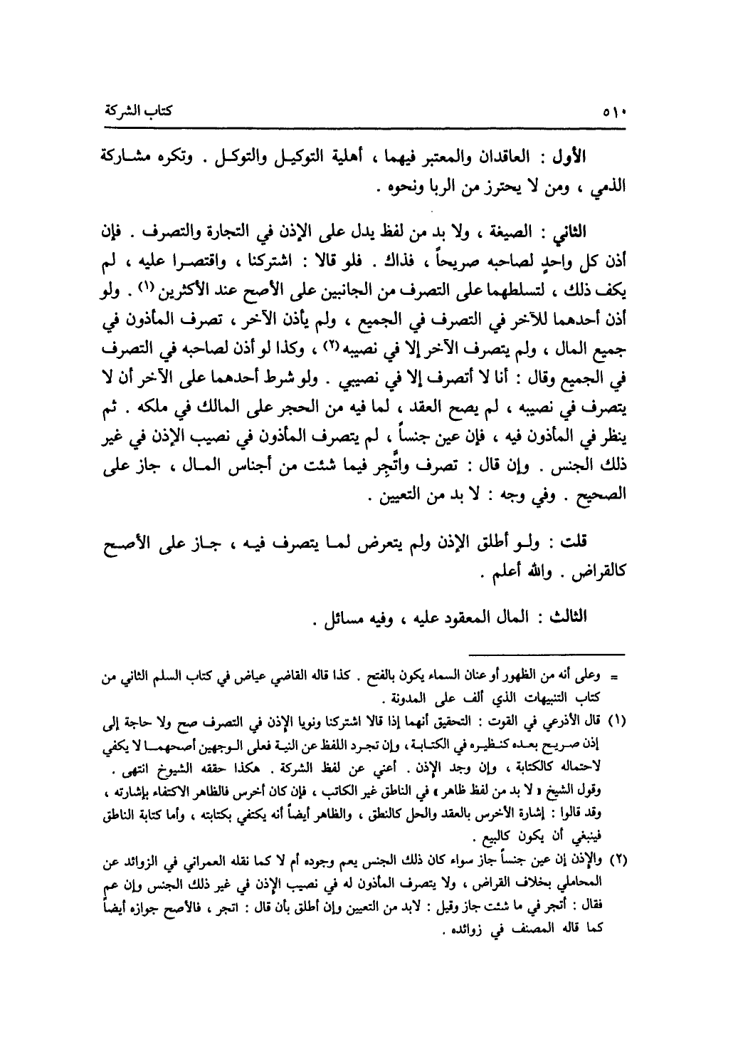 الاول: العاقدان والمعتبر فيهما، أهلية التوكيل والتوكل. وتكره مشاركة الذمي، ومن لا يحترز من الربا ونحوه. الثاني: الصيغة، ولا بد من لفظ يدل على الاذن في التجارة والتصرف. فإن أذن كل واحد لصاحبه صريحا، فذاك. فلو قالا: اشتركنا، واقتصرا عليه، لم يكف ذلك، لتسلطهما على التصرف من الجانبين على الاصح عند الاكثرين. ولو أذن أحدهما للآخر في التصرف في الجميع، ولم يأذن الآخر، تصرف المأذون في جميع المال، ولم يتصرف الآخر إلا في نصيبه، وكذا لو أذن لصاحبه في التصرف في الجميع وقال، أنا لا أتصرف إلا في نصيبي. ولو شرط أحدهما على الآخر أن لا يتصرف في نصيبه، لم يصح العقد، لما فيه من الحجر على المالك في ملكه. ثم ينظر في المأذون فيه، فان عين جنسا، لم يتصرف المأذون في نصيب الاذن في غير ذلك الجنس. وإن قال: تصرف واتجر فيما شئت من أجناس المال، جاز على الصحيح. وفي وجه: لا بد من التعيين. قلت: ولو أطلق الاذن ولم يتعرض لما يتصرف فيه، جاز على الاصح كالقراض. والله أعلم. الثالث: المال المعقود عليه، وفيه مسائل.