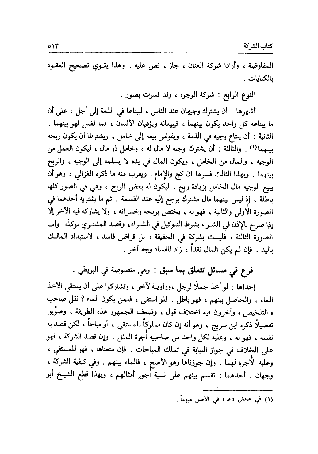 المفاوضة، وأرادا شركة العنان، جاز، نص عليه. وهذا يقوي تصحيح العقود بالكنايات. النوع الرابع: شركة الوجوه، وقد فسرت بصور. أشهرها: أن يشترك وجيهان عند الناس، ليبتاعا في الذمة إلى أجل، على أن ما يبتاعه كل واحد يكون بينهما، فيبيعانه ويؤديان الاثمان، فما فضل فهو بينهما. الثانية: أن يبتاع وجيه في الذمة، ويفوض بيعه إلى خامل، ويشترطا أن يكون ربحه بينهما. والثالثة: أن يشتري وجيه لا مال له، وخامل ذو مال، ليكون العمل من الوجيه، والمال من الخامل، ويكون المال في يده لا يسلمه إلى الوجيه، والربح بينهما. وبهذا الثالث فسرها ابن كج والامام. ويقرب منه ما ذكره الغزالي، وهو أن يبيع الوجيه مال الخامل بزيادة ربح، ليكون له بعض الربح، وهي في الصور كلها باطلة، إذ ليس بينهما مال مشترك يرجع إليه عند القسمة. ثم ما يشتريه أحدهما في الصورة الاولى والثانية، فهو له، يختص بربحه وخسرانه، ولا يشاركه فيه الآخر إلا إذا صرح بالاذن في الشراء بشرط التوكيل في الشراء، وقصد المشتري موكله. وأما الصورة الثالثة، فليست بشركة في الحقيقة، بل قراض فاسد لاستبداد المالك باليد. فان لم يكن المال نقدا، زاد للفساد وجه آخر. فرع في مسائل تتعلق بما سبق وهي منصوصة في البويطي. إحداها: لو أخذ جملا لرجل، وراوية لآخر، وتشاركوا على أن يستقي الآخذ الماء، والحاصل بينهم، فهو باطل. فلو استقى، فلمن يكون الماء ؟ نقل صاحب التلخيص وآخرون فيه اختلاف قول، وضعف الجمهور هذه الطريقة، وصوبوا تفصيلا ذكره ابن سريج، وهو أنه إن كان الماء مملوكا للمستقي، أو مباحا، لكن قصد به نفسه، فهو له، وعليه لكل واحد من صاحبيه أجرة المثل. وإن قصد الشركة، فهو على الخلاف في جواز النيابة في تملك المباحات. فان منعناها، فهو للمستقي، وعليه الاجرة لهما. وإن جوزناها وهو الاصح، فالماء بينهم. وفي كيفية الشركة، وجهان. أحدهما: تقسم بينهم على نسبة أجور أمثالهم، وبهذا قطع الشيخ أبو