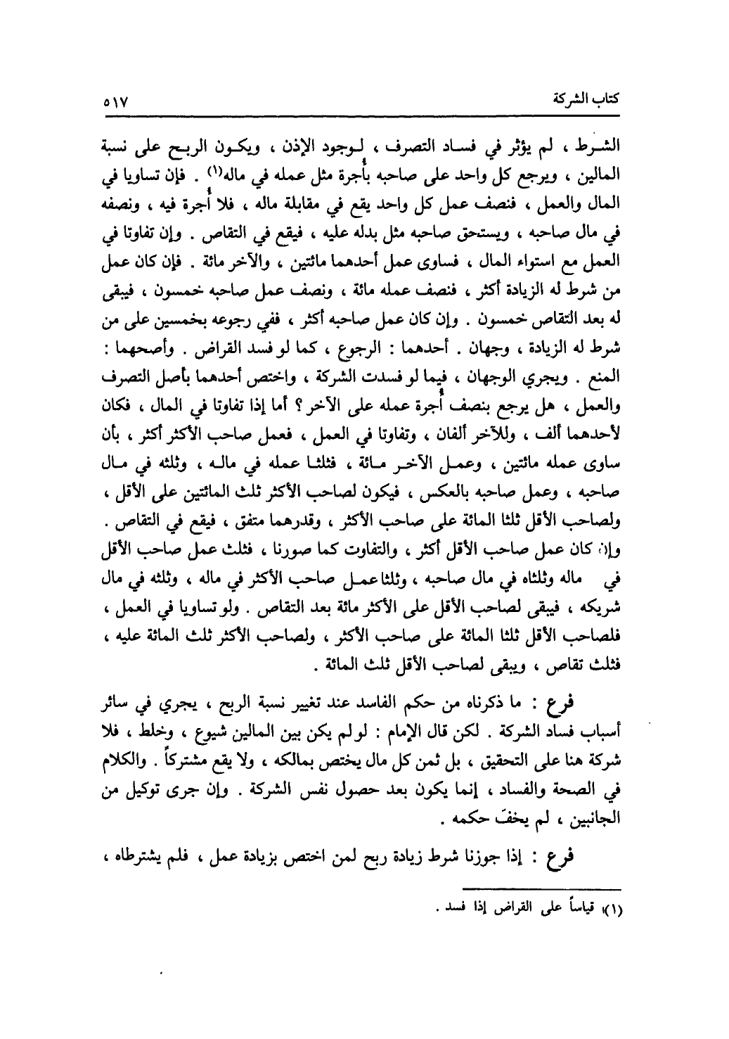 الشرط، لم يؤثر في فساد التصرف، لوجود الاذن، ويكون الربح على نسبة المالين، ويرجع كل واحد على صاحبه بأجرة مثل عمله في ماله. فان تساويا في المال والعمل، فنصف عمل كل واحد يقع في مقابلة ماله، فلا أجرة فيه، ونصفه في مال صاحبه، ويستحق صاحبه مثل بدله عليه، فيقع في التقاص. وإن تفاوتا في العمل مع استواء المال، فساوى عمل أحدهما مائتين، والآخر مائة. فان كان عمل من شرط له الزيادة أكثر، فنصف عمله مائة، ونصف عمل صاحبه خمسون، فيبقى له بعد التقاص خمسون. وإن كان عمل صاحبه أكثر، ففي رجوعه بخمسين على من شرط له الزيادة، وجهان. أحدهما: الرجوع، كما لو فسد القراض. وأصحهما: المنع. ويجري الوجهان، فيما لو فسدت الشركة، واختص أحدهما بأصل التصرف والعمل، هل يرجع بنصف أجرة عمله على الآخر ؟ أما إذا تفاوتا في المال، فكان لاحدهما ألف وللآخر ألفان، وتفاوتا في العمل، فعمل صاحب الاكثر أكثر، بأن ساوي عمله مائتين، وعمل الآخر مائة، فثلثا عمله في ماله، وثلثه في مال صاحبه، وعمل صاحبه بالعكس، فيكون لصاحب الاكثر ثلث المائتين على الاقل، ولصاحب الاقل ثلثا المائة على صاحب الاكثر، وقدرهما متفق، فيقع في التقاص. وإن كان عمل صاحب الاقل أكثر، والتفاوت كما صورنا، فثلث عمل صاحب الاقل في، ماله وثلثاه في مال صاحبه، وثلثا عمل صاحب الاكثر في ماله، وثلثه في مال شريكه، فيبقى لصاحب الاقل على الاكثر مائة بعد التقاص. ولو تساويا في العمل، فلصاحب الاقل ثلثا المائة على صاحب الاكثر، ولصاحب الاكثر ثلث المائة عليه، فثلث تقاص، ويبقى لصاحب الاقل ثلث المائة. فرع ما ذكرناه من حكم الفساد عند تغيير نسبة الربح، يجري في سائر اسباب فساد الشركة. لكن قال الامام: لو لم يكن بين المالين شيوع، وخلط، فلا شركة هنا على التحقيق، بل ثمن كل مال يختص بمالكه، ولا يقع مشتركا. والكلام في الصحة والفساد، إنما يكون بعد حصول نفس الشركة. وإن جرى توكيل من الجانبين، لم يخف حكمه. فرع إذا جوزنا شرط زيادة ربح لمن اختص بزيادة عمل، فلم يشترطاه،