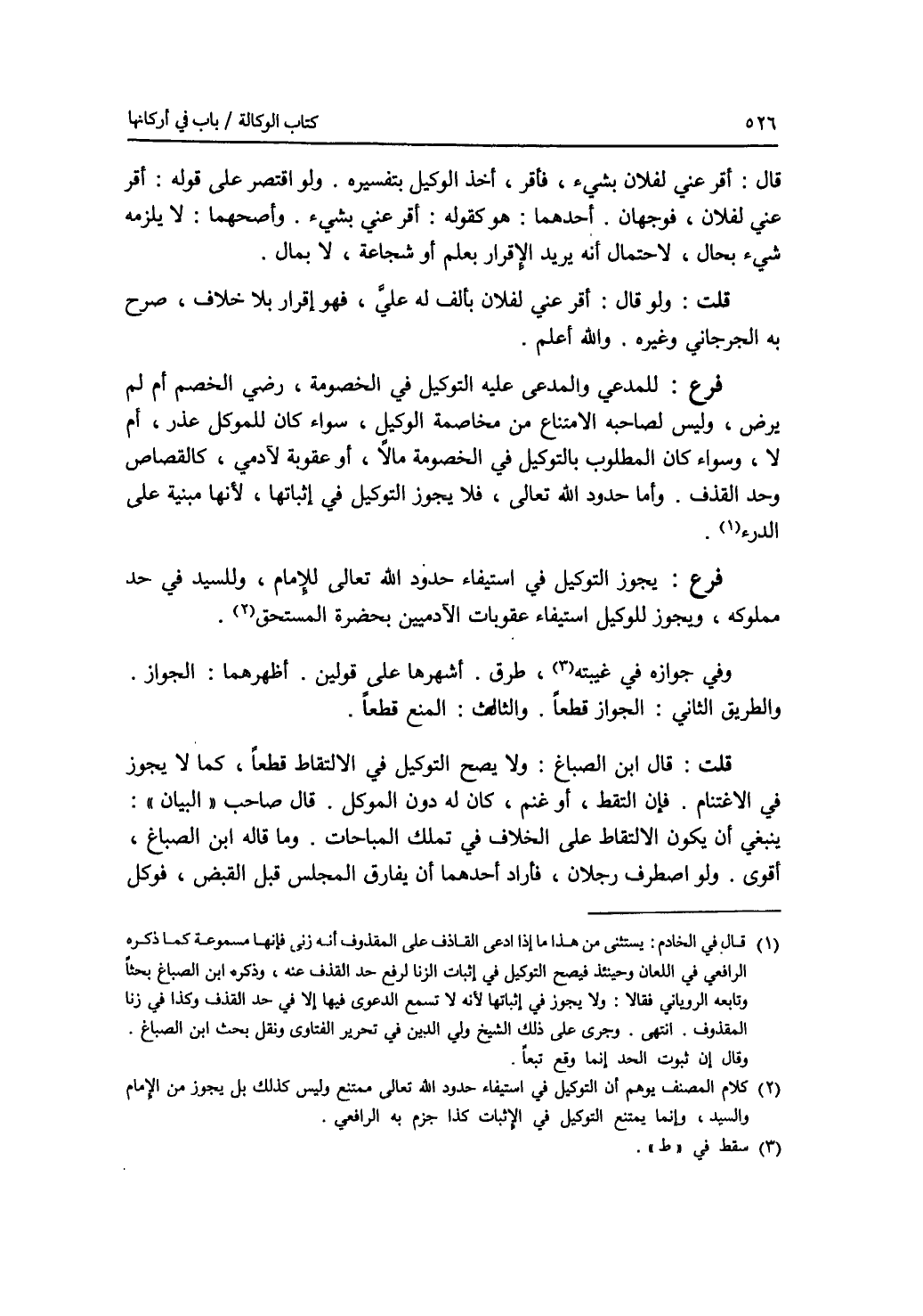 قال: أقر عني لفلان بشئ، فأقر، أخذ الوكيل بتفسيره. ولو اقتصر على قوله: أقر عني لفلان، فوجهان. أحدهما: هو كقوله: أقر عني بشئ. وأصحهما: لا يلزمه شئ بحال، لاحتمال أنه يريد الاقرار بعلم أو شجاعة، لا بمال. قلت: ولو قال: أقر عني لفلان بألف له علي، فهو إقرار بلا خلاف، صرح به الجرجاني وغيره. والله أعلم. فرع للمدعي والمدعى عليه التوكيل في الخصومة، رضي الخصم أم لم يرض، وليس لصاحبه الامتناع من مخاصمة الوكيل، سواء كان للموكل عذر، أم لا، وسواء كان المطلوب بالتوكيل في الخصومة مالا، أو عقوبة لآدمي، كالقصا ص وحد القذف. وأما حدود الله تعالى، فلا يجوز التوكيل في إثباتها، لانها مبنية على ا لدرء. فرع يجوز التوكيل في استيفاء حدود الله تعالى للامام، وللسيد في حد مملوكه، ويجوز للوكيل استيفاء عقوبات الآدميين بحضرة المستحق. وفي غيبته، طرق. أشهرها على قولين. أظهرهما: الجواز. والطريق الثاني: الجواز قطعا. والثالث: المنع قطعا. قلت: قال ابن الصباغ: ولا يصح التوكيل في الالتقاط قطعا، كما لا يجوز في الاغتنام. فإن التقط، أو غنم، كان له دون الموكل. قال صاحب البيان: ينبغي أن يكون الالتقاط على الخلاف في تملك المباحات. وما قاله ابن الصباغ، أقوى. ولو اصطرف رجلان، فأراد أحدهما أن يفارق المجلس قبل القبض، فوكل