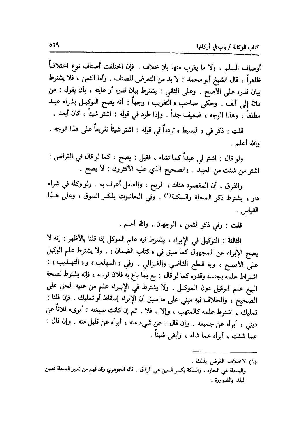 أوصاف السلم، ولا ما يقرب منها بلا خلاف. فإن اختلفت أصناف نوع اختلافا ظاهرا، قال الشيخ أبو محمد: لا بد من التعرض للصنف. وأما الثمن، فلا يشترط بيان قدره على الاصح. وعلى الثاني: يشترط بيان قدره أو غايته، بأن يقول: من مائة إلى ألف. وحكى صاحب التقريب وجها: أنه يصح التوكيل بشراء عبد مطلقا، وهذا لوجه، ضعيف جدا. وإذا طرد في قوله: اشتر شيئا، كان أبعد. قلت: ذكر فالبسيط ترددا في قوله: اشتر شيئا تفريعا على هذا الوجه. والله أعلم. ولو قال: اشتر لي عبدا كما تشاء، فقيل: يصح، كما لو قال في القراض: اشتر من شئت من العبيد. والصحيح الذي عليه الاكثرون: لا يصح. والفرق، أن المقصود هناك الربح، والعامل أعرف به. ولو وكله في شراء دار، يشترط ذكر المحلة والسكة. وفي الحانوت يذكر السوق، وعلى هذا القياس. قلت: وفي ذكر الثمن، الوجهان. والله أعلم. الثالثة: التوكيل في الابراء، يشترط فيه علم الموكل إذا قلنا بالاظهر: إنه لا يصح الابراء عن المجهول كما سبق في كتاب الضمان. ولا يشترط علم الوكيل على الاصح، وبه قطع القاضي والغزالي. وفي المهذب والتهذيب: اشتراط علمه بجنسه وقدره كما لو قال: (بع) بما باع به فلان فرسه، فإنه يشترط لصحة البيع علم الوكيل دون الموكل. ولا يشترط في الابراء علم من عليه الحق على الصحيح، والخلاف فيه مبني على ما سبق أن الابراء إسقاط أو تمليك. فإن قلنا: تمليك، اشترط علمه كالمتهب، وإلا، فلا. ثم إن كانت صيغته: أبرئ فلانا عن ديني، أبرأه عن جميعه. وإن قال: عن شئ منه، أبرأه عن قليل منه. وإن قال: عما شئت، أبرأه عما شاء، وأبقى شيئا.