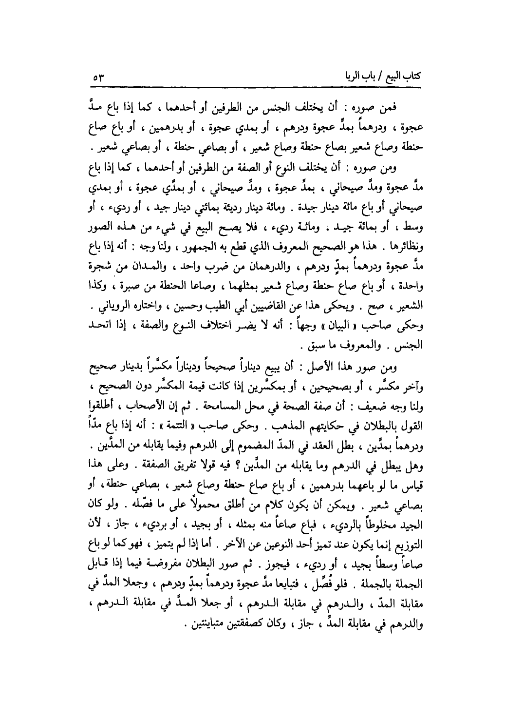 فمن صوره: أن يختلف الجنس من الطرفين أو أحدهما، كما إذا باع مد عجوة، ودرهما بمد عجوة ودرهم، أو بمدي عجوة، أو بدرهمين، أو باع صاع حنطة وصاع شعير بصاع حنطة وصاع شعير، أو بصاعي حنطة، أو بصاعي شعير. ومن صوره: أن يختلف النوع أو الصفة من الطرفين أو أحدهما، كما إذا باع مد عجوة ومد صيحاني، بمد عجوة، ومد صيحاني، أو بمدي عجوة، أو بمدي صيحاني أو باع مائة دينار جيدة، ومائة دينار رديئة بمائتي دينار جيد، أو ردئ، أو وسط، أو بمائة جيد، ومائة ردئ، فلا يصح البيع في شئ من هذه الصور ونظائرها. هذا هو الصحيح المعروف الذي قطع به الجمهور، ولنا وجه: أنه إذا باع مد عجوة ودرهما بمد ودرهم، والدرهمان من ضرب واحد، والمدان من شجرة واحدة، أو باع صاع حنطة وصاع شعير بمثلهما، وصاعا الحنطة من صبرة، وكذا الشعير، صح. ويحكى هذا عن القاضيين أبي الطيب وحسين، واختاره الروياني. وحكى صاحب البيان وجها: أنه لا يضر اختلاف النوع والصفة، إذا اتحد الجنس. والمعروف ما سبق. ومن صور هذا الاصل: أن يبيع دينارا صحيحا ودينارا مكسرا بدينار صحيح وآخر مكسر، أو بصحيحين، أو بمكسرين إذا كانت قيمة المكسر دون الصحيح، ولنا وجه ضعيف: أن صفة الصحة في محل المسامحح. ثم إن الاصحاب، أطلقوا القول بالبطلان في حكايتهم المذهب. وحكى صاحب التتمة: أنه إذا باع مدا ودرهما بمدين، بطل العقد في المد المضموم إلى الدرهم وفيما يقابله من المدين. وهل يبطل في الدرهم وما يقابله من المدين ؟ قيه قولا تفريق الصفقة. وعلى هذا قياس ما لو باعهما بدرهمين، أو باع صاع حنطة وصاع شعير، بصاعي حنطة، أو بصاعي شعير. ويمكن أن يكون كلام من أطلق محمولا على ما فصله. ولو كان الجيد مخلوطا بالردئ، فباع صاعا منه بمثله، أو بجيد، أو بردئ، جاز، لان التوزبع إنما يكون عند تميز أحد النوعين عن الآخر. أما إذا لم يتميز، فهو كما لو باع صاعا وسطا بجيد، أو ردئ، فيجوز. ثم صور البطلان مفروضة فيما إذا قابل الجملة بالجملة. فلو فصل، فتبايعا مد عجوة ودرهما بمد ودرهم، وجعلا المد في مقابلة المد، والدرهم في مقابلة الدراهم، أو جعلا المد في مقابلة الدراهم، والدراهم في مقابلة المد جاز، وكان كصفقتين متباينتين.