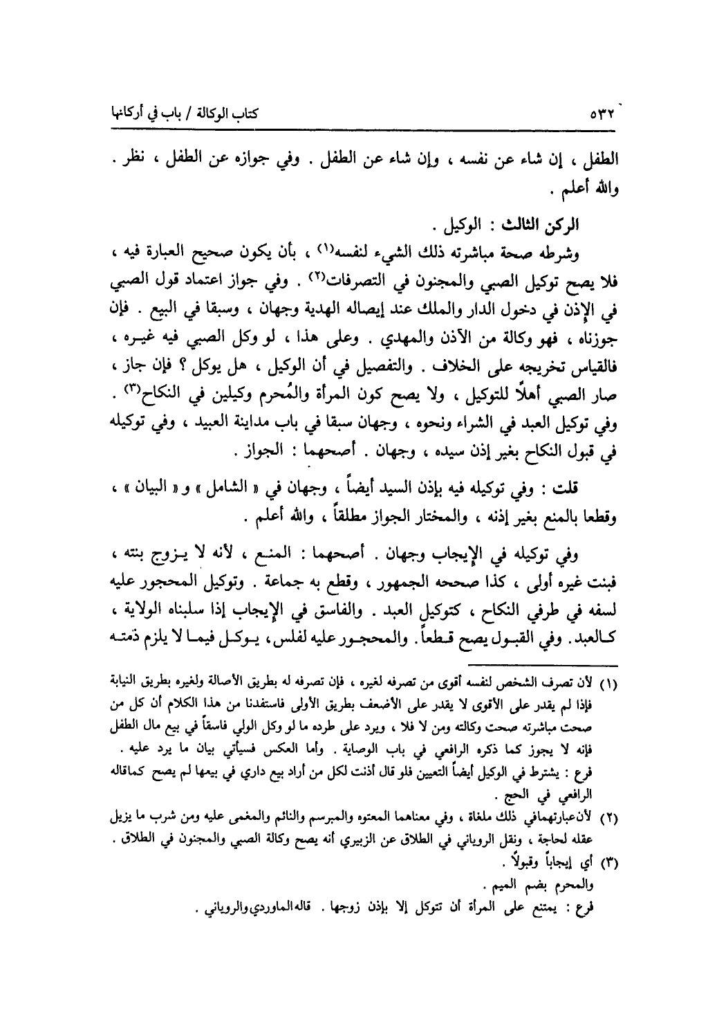 الطفل، إن شاء عن نفسه، وإن شاء عن الطفل. وفي جوازه عن الطفل، نظر. والله أعلم. الركن الثالث: الوكيل. وشرطه صحة مباشرته ذلك الشئ لنفسه، بأن يكون صحيح العبارة فيه، فلا يصح توكيل الصبي والمجنون في التصرفات. وفي جواز اعتماد قول الصبي في الاذن في دخول الدار والملك عند إيصاله الهدية وجهان، وسبقا في البيع. فإن جوزناه، فهو وكالة من الآذن والمهدي. وعلى هذا، لو وكل الصبي فيه غيره، فالقياس تخريجه على الخلا ف. والتفصيل في أن الوكيل، هل يوكل ؟ فإن جاز، صار الصبي أهلا للتوكيل، ولا يصح كون المرأة والمحرم وكيلين في النكاح. وفي توكيل العبد في الشراء ونحوه، وجهان سبقا في باب مداينة العبيد. وفي توكيله في قبول النكاح بغير إذن سيده، وجهان. أصحهما: الجواز. قلت: وفي توكيله فيه بإذن السيد أيضا، وجهان في الشامل والبيان، وقطعا بالمنع بغير إذنه، والمختار الجواز مطلقا. والله أعلم. وفي توكيله في الايجاب وجهان. أصحهما: المنع، لانه لا يزوج بنته، فبنت غيره أولى، كذا صححه الجمهور، وقطع به جماعة. وتوكيل المحجوز عليه لسفه في طرفي النكاح، كتوكيل العبد. والفاسق في الايجاب إذا سلبناه الولاية، كالعبد، وفي القبول يصح قطعا. والمحجوز عليه لفلس، يوكل فيما لا يلزم ذمته