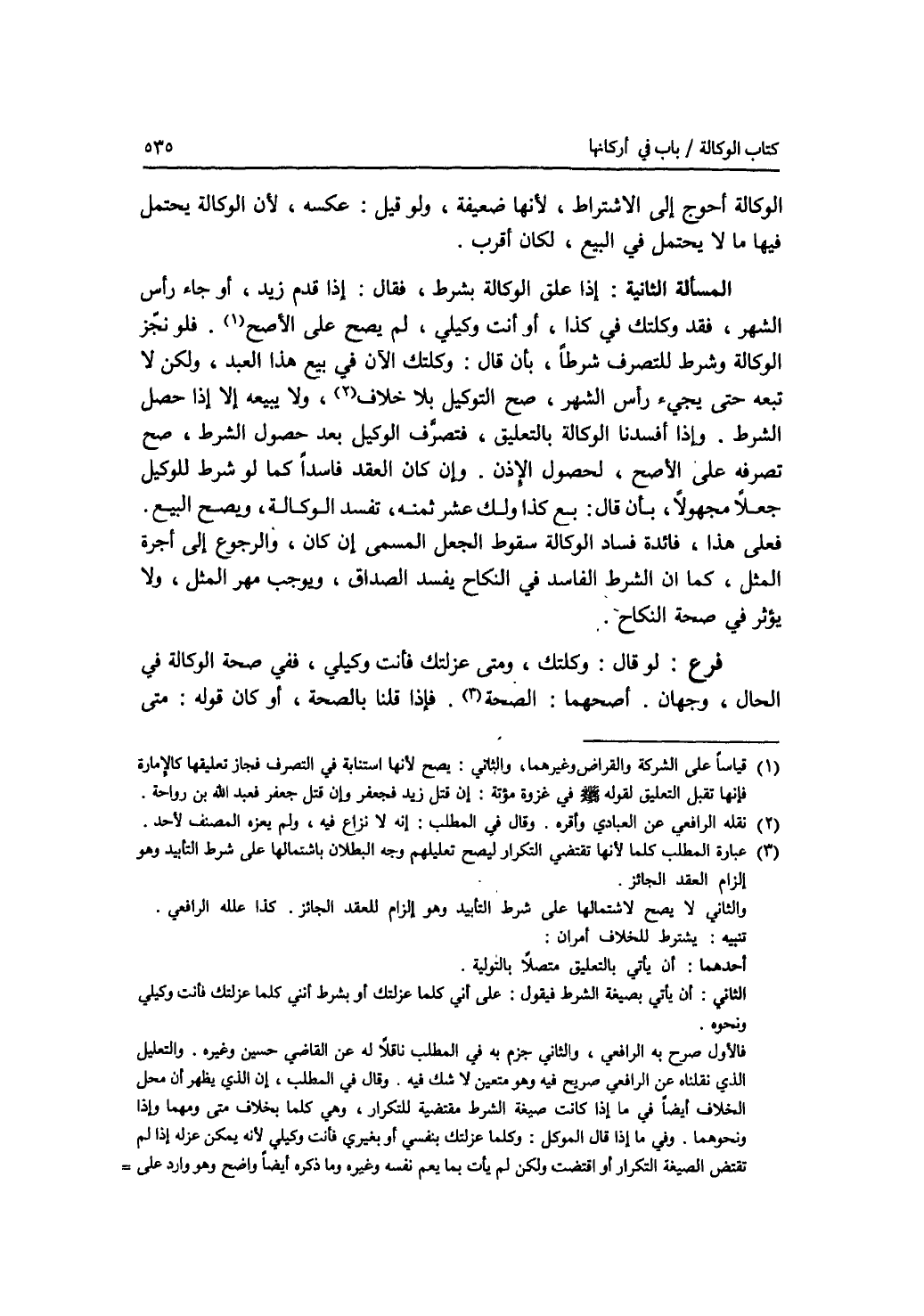 الوكالة أحوج إلى الاشتراط، لانها ضعيفة، ولو قيل: عكسه، لان الوكالة يحتمل فيها ما لا يحتمل في البيع، لكان أقرب. المسألة الثانية: إذا علق الوكالة بشرط، فقال: إذا قدم زيد، أو جاء رأس الشهر، فقد وكلتك في كذا، أو أنت وكيلي، لم يصح على الاصح. فلو نجز الوكالة وشرط للتصرف شرطا، بأن قال: وكلتك الآن في بيع هذا العبد، ولكن لا تبعه حتى يجئ رأس الشهر، صح التوكيل بلا خلاف، ولا يبيعه إلا إذا حصل الشرط. وإذا أفسدنا الوكالة بالتعليق، فتصرف الوكيل بعد حصول الشرط، صح تصرفه على الاصح، لحصول الاذن. وإن كان العقد فاسدا كما لو شرط للوكيل جعلا مجهولا، بأن قال: بع كذا ولك عشر ثمنه، تفسد الوكالة، ويصح البيع. فعلى هذا، فائدة فساد الوكالة سقوط الجعل المسمى إن كان، والرجوع إلى أجرة المثل، كما أن الشرط الفاسد في النكاح يفسد الصداق، ويوجب مهر المثل، ولا يؤثر في صحة النكاح. فرع لو قال: وكلتك، ومتى عزلتك فأنت وكيلي، ففي صحة الوكالة في الحال، وجهان. أصحهما: الصحة. فإذا قلنا بالصحة، أو كان قوله: متى