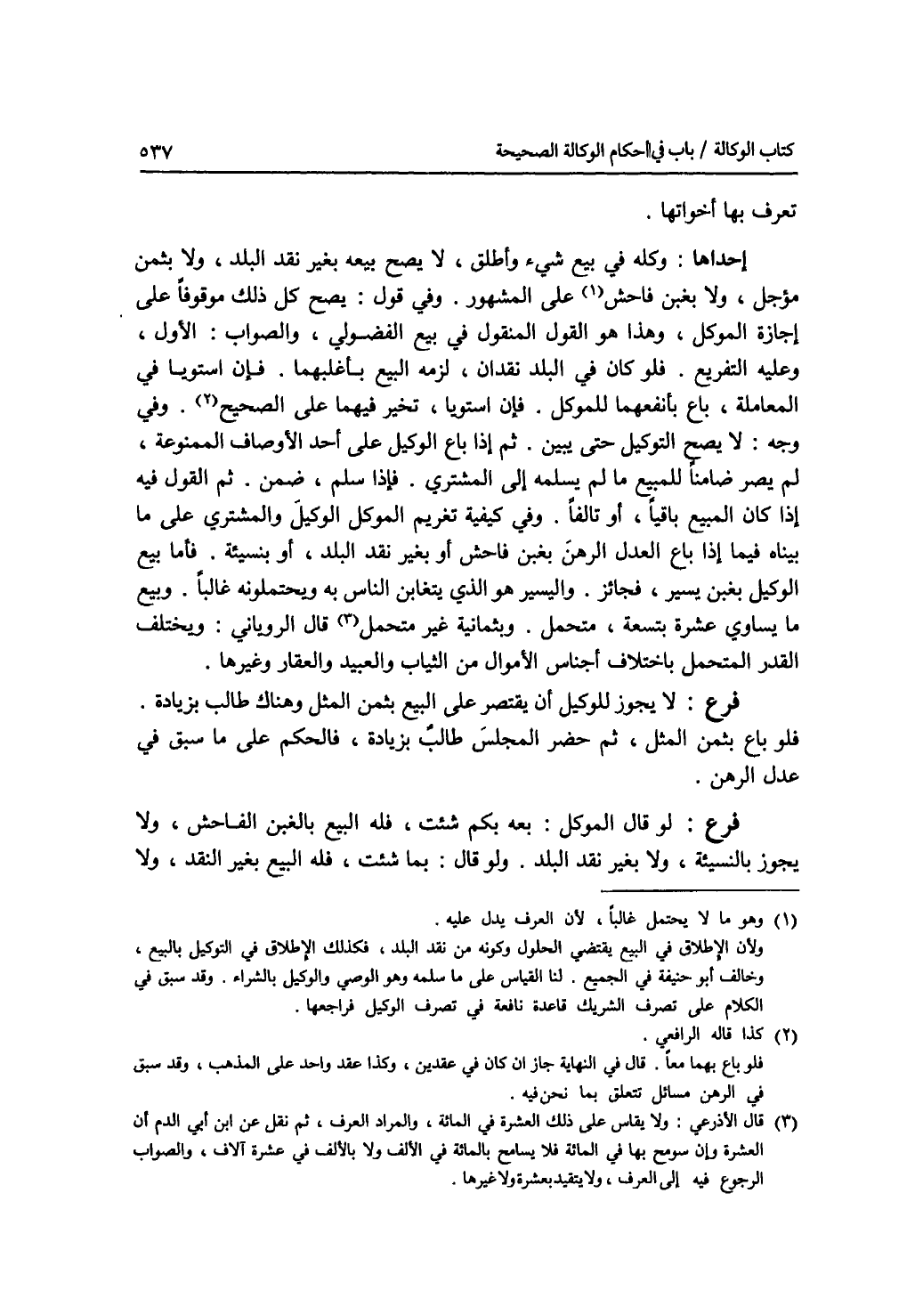 تعرف بها أخواتها. إحداها: وكله في بيع شئ وأطلق، لا يصح بيعه بغير نقد البلد، ولا بثمن مؤجل، ولا بغبن فاحش على المشهور. وفي قول: يصح كل ذلك موقوفا على إجازة الموكل، وهذا هو القول المنقول في بيع الفضولي، والصواب: الاول، وعليه التفريع. فلو كان في البلد نقدان، لزمه البيع بأغلبهما. فإن استويا في المعاملة، باع بأنفعهما للموكل. فإن استويا، تخير فيهما على الصحيح. وفي وجه: لا يصح الوكيل حتى يبين. ثم إذا باع الوكيل على أحد الاوصاف الممنوعة، لم يصر ضامنا للمبيع ما لم يسلمه إلى المشتري. فإذا سلم، ضمن. ثم القول فيه إذا كان المبيع باقيا، أو تالفا. وفي كيفية تغريم الموكل الوكيل والمشتري على ما بيناه فيما إذا باع العدل الرهن بغبن فاحش أو بغير نقد البلد، أو بنسيئة. فأما بيع الوكيل بغبن يسير، فجائز. واليسير هو الذي يتغابن الناس به ويحتملونه غالبا. وبيع ما يساوي عشرة بتسعة، متحمل. وبثمانية غير متحمل قال الروياني: ويختلف القدر المتحمل باختلاف أجناس الثياب من الثياب والعبيد والعقار وغيرها. فرع لا يجوز للوكيل أن يقتص على البيع بثمن المثل وهناك طالب بزيادة. فلو باع بثمن المثل، ثم حضر المجلس طالب بزيادة، فالحكم على ما سبق في عدل الرهن. فرع لو قال الموكل: بعه بكم شئت، فله البيع بالغبن الفاحش، ولا يجوز بالنسيئة، ولا بغير نقد البلد. ولو قال: بما شئت، فله البيع بغير النقد، ولا