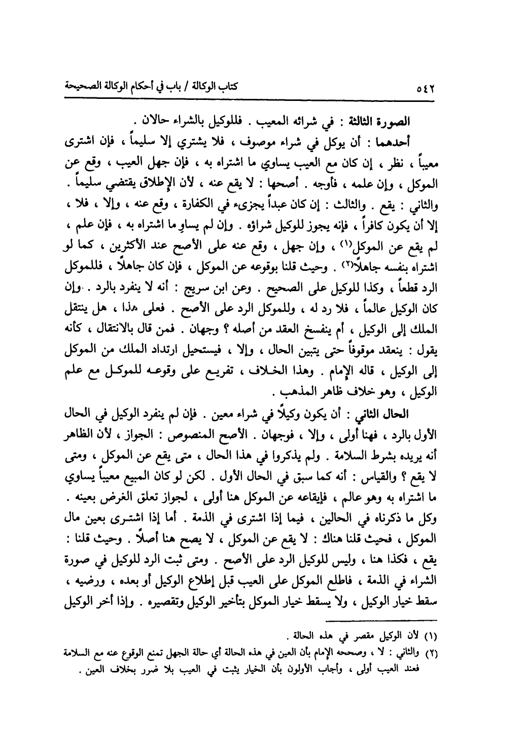 الصورة الثالثة: في شرائه المعيب. فللوكيل بالشراء حالان. أحدهما: أن يوكل في شراء موصوف، فلا يشتري إلا سليما، فإن اشترى معيبا، نظر، إن كان مع العيب يساوي ما اشتراه به، فإن جهل العيب، وقع عن الموكل، وإن علمه، فأوجه. أصحها: لا يقع عنه، لان الاطلاق يقتضي سليما. والثاني: يقع. والثالث: إن كان عبدا يجزئ في الكفارة، وقع عنه، وإلا، فلا، إلا أن يكون كافرا، فإنه يجوز للوكيل شراؤه. وإن لم يساو ما اشتراه (به)، فإن علم، لم يقع عن الموكل، وإن جهل، وقع عنه على الاصح عند الاكثرين، كما لو اشتراه بنفسه جاهلا. وحيث قلنا بوقوعه عن الموكل، فإن كان جاهلا، فللموكل الرد قطعا، وكذا للوكيل على الصحيح. وعن ابن سريج: أنه لا ينفرد بالرد. وإن كان الوكيل عالما، فلا رد له، وللموكل الرد على الاصح. فعلى هذا، هل ينتقل الملك إلى الوكيل، أم ينفسخ العقد من أصله ؟ وجهان. فمن قال بالانتقال، كأنه يقول: ينعقد موقوفا حتى يتبين الحال، وإلا، فيستحيل ارتداد الملك من الموكل إلى الوكيل، قاله الامام. وهذا الخلاف، تفريع على وقوعه للموكل مع علم الوكيل، وهو خلاف ظاهر المذهب. الحال الثاني: أن يكون وكيلا في شراء معين. فإن لم ينفرد الوكيل في الحال الاول بالرد، فهنا أولى، وإلا، فوجهان. الاصح المنصوص: الجواز، لان الظاهر أنه يريده بشرط السلامة. ولم يذكروا في هذا الحال، متى يقع عن الموكل، ومتى لا يقع ؟ والقياس: أنه كما سبق في الحال الاول. لكن لو كان المبيع معيبا يساوي ما اشتراه به وهو عالم، فايقاعه عن الموكل هنا أولى، لجواز تعلق الغرض بعينه. وكل ما ذكرناه في الحالين، فيما إذا اشترى في الذمة. أما إذا اشترى بعين مال الموكل، فحيث قلنا هناك: لا يقع عن الموكل، لا يصح هنا أصلا. وحيث قلنا: يقع، فكذا هنا، وليس للوكيل الرد على الاصح. ومتى ثبت الرد للوكيل في صورة الشراء في الذمة، فاطلع الموكل على العيب قبل اطلاع الوكيل أو بعده، ورضيه، سقط خيار الوكيل، ولا يسقط خيار الموكل بتأخير الوكيل وتقصيره. وإذا أخر الوكيل