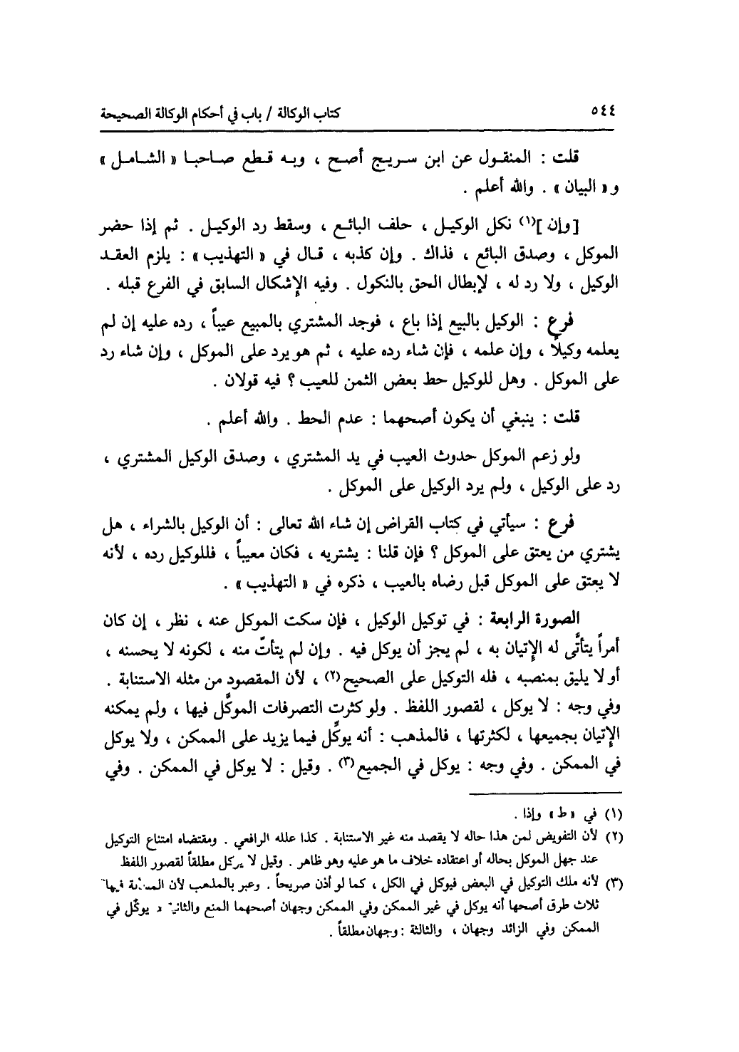 قلت: المنقول عن ابن سريج أصح، وبه قطع صاحبا الشامل والبيان. والله أعلم. وإن نكل الوكيل، حلف البائع، وسقط رد الوكيل. ثم إذا حضر الموكل، وصدق البائع، فذاك. وإن كذبه، قال في التهذيب: يلزم العقد الوكيل، ولا رد له، لابطال الحق بالنكول. وفيه الاشكال السابق في الفرع قبله. فرع الوكيل بالبيع إذا باع، فوجد المشتري بالمبيع عيبا، رده عليه إن لم يعلمه وكيلا، وإن علمه، فإن شاء رده عليه، ثم هو يرد على الموكل، وإن شاء رد على الموكل. وهل للوكيل حط بعض الثمن للعيب ؟ فيه قولان. قلت: ينبغي أن يكون أصحهما: عدم الحط. والله أعلم. ولو زعم الموكل حدوث العيب في يد المشتري، وصدق الوكيل المشتري، رد على الوكيل، ولم يرد الوكيل على الموكل. فرع سيأتي في كتاب القراض إن شاء الله تعالى: أن الوكيل بالشراء، هل يشتري من يعتق على الموكل ؟ فإن قلنا: يشتريه، فكان معيبا، فللوكيل رده، لانه لا يعتق على الموكل قبل رضاه بالعيب، ذكره في التهذيب. الصورة الرابعة: في توكيل الوكيل، فإن سكت الموكل عنه، نظر، إن كان أمرا يتأتى له الاتيان به، لم يجز أن يوكل فيه. وإن لم يتأت منه، لكونه لا يحسنه، أو لا يليق بمنصبه، فله التوكيل على الصحيح، لان المقصود من مثله الاستنابة. وفي وجه: لا يوكل، لقصور اللفظ. ولو كثرت التصرفات الموكل فيها، ولم يمكنه الاتيان بجميعها، لكثرتها، فالمذهب: أنه يوكل فيما يزيد على الممكن، ولا يوكل في الممكن. وفي وجه: يوكل في الجميع. وقيل: لا يوكل في الممكن. وفي