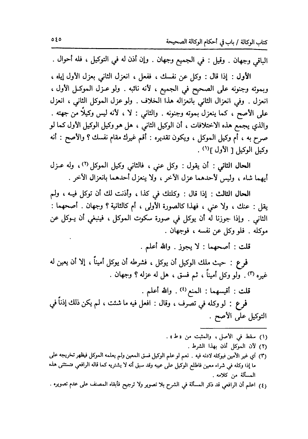 الباقي وجهان. وقيل: في الجميع وجهان. وإن أذن له في التوكيل، فله أحوال. الاول: إذا قال: وكل عن نفسك، ففعل، انعزل الثاني بعزل الاول إياه، وبموته وجنونه على الصحيح في الجميع، لانه نائبه. ولو عزل الموكل الاول، انعزل. وفي انعزال الثاني بإنعزاله هذا الخلاف. ولو عزل الموكل الثاني، انعزل على الاصح، كما ينعزل بموته وجنونه. والثاني: لا، لانه ليس وكيلا من جهته. والذي يجمع هذه الاختلافات، أن الوكيل الثاني، هل هو وكيل الوكيل الاول كما لو صرح به، أم وكيل الموكل، ويكون تقديره: أقم غيرك مقام نفسك ؟ والاصح: أنه وكيل الوكيل الاول. الحال الثاني: أن يقول: وكل عني، فالثاني وكيل الموكل، وله عزل أيهما شاء، وليس لاحدهما عزل الآخر، ولا ينعزل أحدهما بانعزال الآخر. الحال الثالث: إذا قال: وكلتك في كذا، وأذنت لك أن توكل فيه، ولم يقل: عنك، ولا عني، فهذا كالصورة الاولى، أم كالثانية ؟ وجهان. أصحهما: الثاني. وإذا جوزنا له أن يوكل في صورة سكوت الموكل، فينبغي أن يوكل عن موكله. فلو وكل عن نفسه، فوجهان. قلت: أصحهما: لا يجوز. والله أعلم. فرع حيث ملك الوكيل أن يوكل، فشرطه أن يوكل أمينا، إلا أن يعين له غيره. ولو وكل أمينا، ثم فسق، هل له عزله ؟ وجهان. قلت: أقيسهما: المنع. والله أعلم. فرع لو وكله في تصرف، وقال: افعل فيه ما شئت، لم يكن ذلك إذنا في التوكيل على الاصح.
