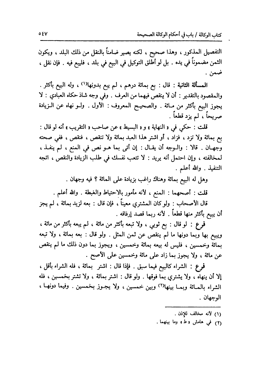 التفصيل المذكور، وهذا صحيح، لكنه يصير ضامنا بالنقل من ذلك البلد، ويكون الثمن مضمونا في يده. بل لو أطلق التوكيل في البيع في بلد، فليبع فيه فإن نقل، ضمن. المسألة الثانية: قال: بع بمائة درهم، لم يبع بدونها، وله البيع بأكثر. والمقصود بالتقدير: أن لا ينقص فيهما من العرف. وفي وجه شاذ حكاه العبادي: لا يجوز البيع بأكثر من مائة. والصحيح المعروف: الاول. ولو نهاه عن الزيادة صريحا، لم يزد قطعا. قلت: حكي في النهاية والبسيط عن صاحب التقريب أنه لو قال: بع بمائة ولا تزد، فزاد، أو اشتر هذا العبد بمائة ولا تنقص، فنقص، ففي صحته وجهان. قالا: والوجه أن يقال: إن أتى بما هو نص في المنع، لم ينفذ، لمخالفته، وإن احتمل أنه يريد: لا تتعب نفسك في طلب الزيادة والنقص، اتجه التنفيذ. والله أعلم. وهل له البيع بمائة وهناك راغب بزيادة على المائة ؟ فيه وجهان. قلت: أصحهما: المنع، لانه مأمور بالاحتياط والغبطة. والله أعلم. قال الاصحاب: ولو كان المشتري معينا، فإن قال: بعه لزيد بمائة، لم يجز أن يبيع بأكثر منها قطعا، لانه ربما قصد إرفافه. فرع لو قال: بع ثوبي، ولا تبعه بأكثر من مائة، لم يبعه بأكثر من مائة، ويبيع بها وبما دونها ما لم ينقص عن ثمن المثل. ولو قال: بعه بمائة، ولا تبعه بمائة وخمسين، فليس له بيعه بمائة وخمسين، ويجوز بما دون ذلك ما لم ينقص عن مائة، ولا يجوز بما زاد على مائة وخمسين على الاصح. فرع الشراء كالبيع فيما سبق. فإذا قال: اشتر بمائة، فله الشراء بأقل، إلا أن ينهاه، ولا يشتري بما فوقها. ولو قال: اشتر بمائة، ولا تشتر بخمسين، فله الشراء بالمائة وبما بينها وبين خمسين، ولا يجوز بخمسين. وفيما دونها، الوجهان.
