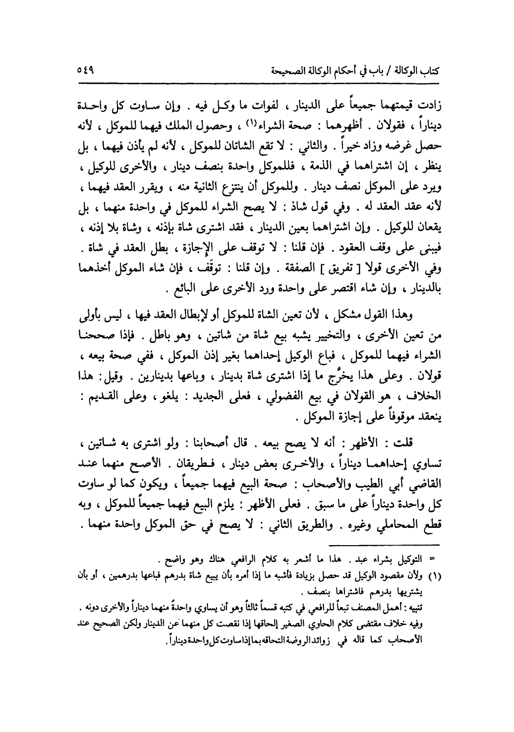 زادت قيمتهما جميعا على الدينار، لفوات ما وكل فيه. وإن ساوت كل واحدة دينارا، فقولان. أظهرهما: صحة الشراء، وحصول الملك فيهما للموكل، لانه حصل غرضه وزاد خيرا. والثاني: لا تقع الشاتان للموكل، لانه لم يأذن فيهما، بل ينظر، إن اشتراهما في الذمة، فللموكل واحدة بنصف دينار، والاخرى للوكيل، ويرد على الموكل نصف دينار. وللموكل أن ينتزع الثانية منه، ويقرر العقد فيهما، لانه عقد العقد له. وفي قول شاذ: لا يصح الشراء للموكل في واحدة منهما، بل يقعان للوكيل. وإن اشتراهما بعين الدينار، فقد اشترى شاة باذنه، وشاة بلا إذنه، فيبنى على وقف العقود. فإن قلنا: لا توقف على الاجازة، بطل العقد في شاة. وفي الاخرى قولا (تفريق) الصفقة. وإن قلنا: توقف، فإن شاء الموكل أخذهما بالدينار، وإن شاء اقتصر على واحدة ورد الاخرى على البائع. وهذا القول مشكل، لان تعين الشاة للموكل أو لابطال العقد فيها، ليس بأولى من تعين الاخرى، والتخيير يشبه بيع شاة من شاتين، وهو باطل. فإذا صححنا الشراء فيهما للموكل، فباع الوكيل إحداهما بغير إذن الموكل، ففي صحة بيعه، قولان. وعلى هذا يخرج ما إذا اشترى شاة بدينار، وباعها بدينارين. وقيل: هذا الخلاف، هو القولان في بيع الفضولي، فعلى الجديد: يلغو، وعلى القديم: ينعقد موقوفا على إجازة الموكل. قلت: الاظهر: أنه لا يصح بيعه. قال أصحابنا: ولو اشترى به شاتين، تساوي إحداهما دينارا، والاخرى بعض دينار، فطريقان. الاصح منهما عند القاضي أبي الطيب والاصحاب: صحة البيع فيهما جميعا، ويكون كما لو ساوت كل واحدة دينارا على ما سبق. فعلى الاظهر: يلزم البيع فيهما جميعا للموكل، وبه قطع المحاملي وغيره. والطريق الثاني: لا يصح في حق الموكل واحدة منهما.
