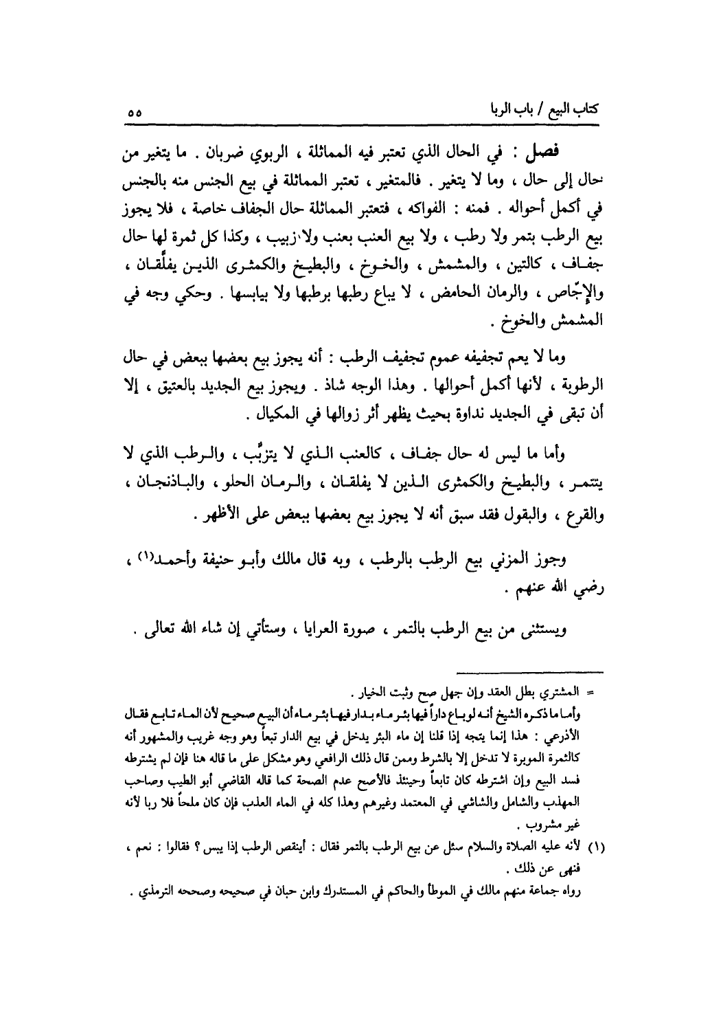 فصل في الحال الذي تعتبر فيه المماثلة، الربوي ضربان. ما يتغير من حال إلى حال، وما لا يتغير. فالمتغير، تعتبر المماثلة في بيع الجنس منه بالجنس في أكمل أحواله. فمنه: الفواكه، فتعتبر المماثلة حال الجفاف خاصة، فلا يجوز بيع الرطب بتمر ولا رطب، ولا بيع العنب بعنب ولا زبيب، وكذا كل ثمرة لها حال جفاف، كالتين، والمشمش، والخوخ، والبطيخ والكمثري الذين يفلقان، والاجاص، والرمان الحامض، لا يباع رطبها برطبها ولا بيابسها. وحكى وجه في المشمش والخوخ، وما لا يعم تجفيفه عموم تجفيف الرطب: أنه يجوز بيعها بعضها ببعض في حال الرطوبة، لانها أكمل أحوالها. وهذا الوجه شاذ. ويجوز بيع الجديد بالعتيق، إلا أن تبقى في الجديد نداوة بحيث يظهر أثر زوالها في المكيال. وأما ما ليس له حال جفاف، كالعنب الذي لا يتزبب، والرطب الذي لا يتتمر، والبطيخ والكمثرى اللذين لا يفلقان، والرمان الحلو، والباذنجان، والقرع، والبقول، فقد سبق أنه لا يجوز جيع بعضها ببعض على الاظهر. ويجوز المزني بيع الرطب بالرطب، وبه قال مالك وأبو حنيفة وأحمد، رضي الله عنهم. ويستثنى من بيع الرطب بالتمر، صورة العرايا، وستأتي إن شاء الله تعالى.