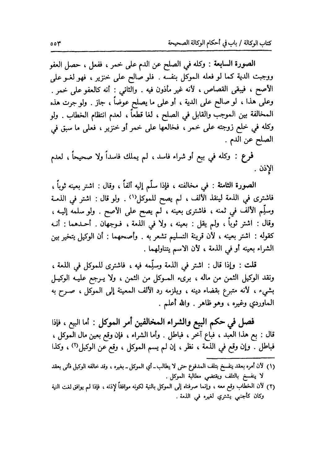 الصورة السابعة: وكله في الصلح عن الدم على خمر، ففعل، حصل العفو ووجبت الدية كما لو فعله الموكل بنفسه. فلو صالح على خنزير، فهو لغو على الاصح، فيبقى القصاص، لانه غير مأذون فيه. والثاني: أنه كالعفو على خمر. وعلى هذا، لو صالح على الدية، أو على ما يصلح عوضا، جاز. ولو جرت هذه المخالفة بين الموجب والقابل في الصلح، لغا قطعا، لعدم انتظام الخطاب. ولو وكله في خلع زوجته على خمر، فخالعها على خمر أو خنزير، فعلى ما سبق في الصلح عن الدم. فرع وكله في بيع أو شراء فاسد، لم يملك فاسدا ولا صحيحا، لعدم الاذن. الصورة الثامنة: في مخالفته، فإذا سلم إليه ألفا، وقال: اشتر بعينه ثوبا، فاشترى في الذمة لينقذ الالف، لم يصح للموكل. ولو قال: اشتر في الذمة وسلم الالف في ثمنه، فاشترى بعينه، لم يصح على الاصح. ولو سلمه إليه، وقال: اشتر ثوبا، ولم يقل: بعينه، ولا في الذمة، فوجهان. أحدهما: أنه كقوله: اشتر بعينه، لان قرينة التسليم تشعر به. وأصحهما: أن الوكيل يتخير بين الشراء بعينه أو في الذمة، لان الاسم يتناولهما. قلت: وإذا قال: اشتر في الذمة وسلمه فيه، فاشترى للموكل في الذمة، ونقد الوكيل الثمن من ماله، برئ الموكل من الثمن، ولا يرجع عليه الوكيل بشئ، لانه متبرع بقضاء دينه، ويلزمه رد الالف المعينة إلى الموكل، صرح به الماوردي وغيره، وهو ظاهر. والله أعلم.