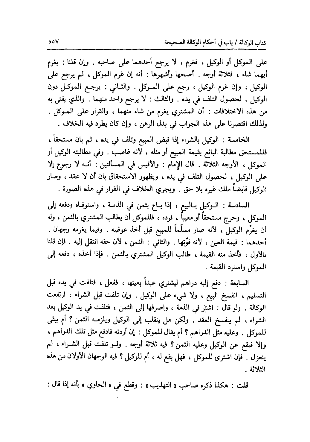 على الموكل أو الوكيل، فغرم، لا يرجع أحدهما على صاحبه. وإن قلنا: يغرم أيهما شاء، فثلاثة أوجه. أصحها وأشهرها: أنه إن غرم الموكل، لم يرجع على الوكيل، وإن غرم الوكيل، رجع على الموكل. والثاني: يرجع الموكل دون الوكيل، لحصول التلف في يده. والثالث: لا يرجع واحد منهما. والذي يفتى به من هذه الاختلافات: أن المشتري يغرم من شاء منهما، والقرار على الموكل. ولذلك اقتصرنا على هذا الجواب في بدل الرهن وإن كان يطرد فيه الخلاف. الخامسة: الوكيل بالشراء إذا قبض المبيع وتلف في يده، ثم بان مستحقا، فللمستحق مطالبة البائع بقيمة المبيع أو مثله، لانه غاصب. وفي مطالبته الوكيل أو الموكل، الاوجه الثلاثة. قال الامام: والاقيس في المسألتين: أنه لا رجوع إلا على الوكيل، لحصول التلف في يده، وبظهور الاستحقاق بان أن لا عقد، وصار الوكيل قابضا ملك غيره بلا حق. ويجري الخلاف في القرار في هذه الصورة. السادسة: الوكيل بالبيع، إذا باع بثمن في الذمة، واستوفاه ودفعه إلى الموكل، وخرج مستحقا أو معيبا، فرده، فللموكل أن يطالب المشتري بالثمن، وله أن يغرم الوكيل، لانه صار مسلما للمبيع قبل أخذ عوضه. وفيما يغرمه وجهان. أحدهما: قيمة العين، لانه فوتها. والثاني: الثمن، لان حقه انتقل إليه. فإن قلنا بالاول، فأخذ منه القيمة، طالب الوكيل المشتري بالثمن. فإذا أخذه، دفعه إلى الموكل واسترد القيمة. السابعة: دفع إليه دراهم ليشتري عبدا بعينها، ففعل، فتلفت في يده قبل التسليم، انفسخ البيع، ولا شئ على الوكيل. وإن تلفت قبل الشراء، ارتفعت الوكالة. ولو قال: اشتر في الذمة، واصرفها إلى الثمن، فتلفت في يد الوكيل بعد الشراء، لم ينفسخ العقد. ولكن هل ينقلب إلى الوكيل ويلزمه الثمن ؟ أم يبقى للموكل. وعليه مثل الدراهم ؟ أم يقال للموكل: إن أردته فادفع مثل تلك الدراهم، وإلا فيقع عن الوكيل وعليه الثمن ؟ فيه ثلاثة أوجه. ولو تلفت قبل الشراء، لم ينعزل. فإن اشترى للموكل، فهل يقع له، أم للوكيل ؟ فيه الوجهان الاولان من هذه الثلاثة. قلت: هكذا ذكره صاحب التهذيب: وقطع في الحاوي بأنه إذا قال: