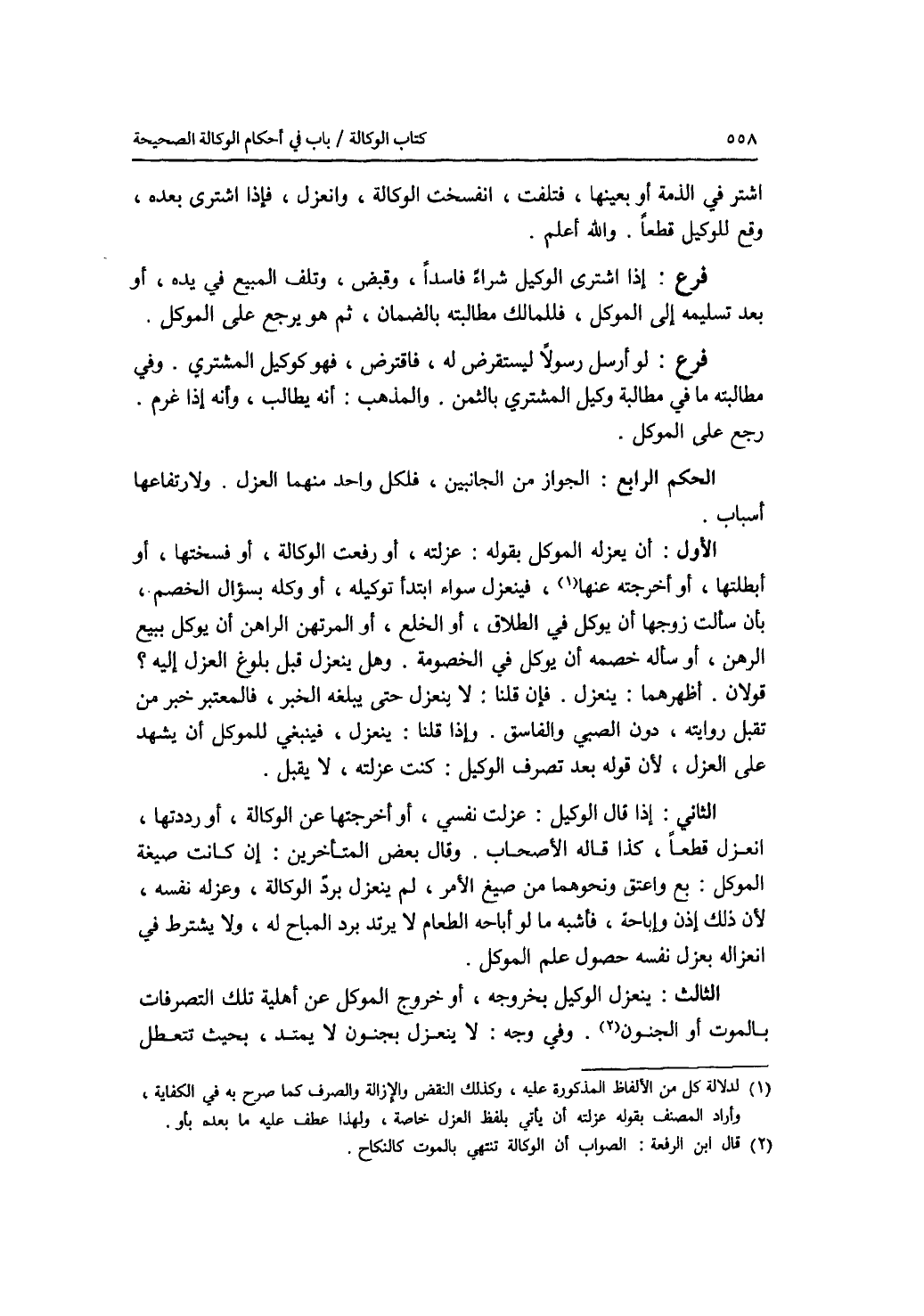 اشتر في الذمة أو بعينها، فتلفت، انفسخت الوكالة، وانعزل، فإذا اشترى بعده، وقع للوكيل قطعا. والله أعلم. فرع إذا اشترى الوكيل شراء فاسدا، وقبض، وتلف المبيع في يده، أو بعد تسليمه إلى الموكل، فللمالك مطالبته بالضمان، ثم هو يرجع على الموكل. فرع لو أرسل رسولا ليستقرض له، فاقترض، فهو كوكيل المشتري. وفي مطالبته ما في مطالبة وكيل المشتري بالثمن. والمذهب: أنه يطالب، وأنه إذا غرم، رجع على الموكل. الحكم الرابع: الجواز من الجانبين، فلكل واحد منهما العزل. ولاتفاعها أسباب. الاول: أن يعزله الموكل بقوله: عزلته، أو رفعت الوكالة، أو فسختها، أو أبطلتها، أو أخرجته عنها، فينعزل سواء ابتدأ توكيله، أو وكله بسؤال الخصم، بأن سألت زوجها أن يوكل في الطلاق، أو الخلع، أو المرتهن الراهن أن يوكل ببيع الرهن، أو سأله خصمه أن يوكل في الخصومة. وهل ينعزل قبل بلوغ العزل إليه ؟ قولان. أظهرهما: ينعزل. فإن قلنا: لا ينعزل حتى يبلغه الخبر، فالمعتبر خبر من تقبل روايته، دون الصبي والفاسق. وإذا قلنا: ينعزل، فينبغي للموكل أن يشهد على العزل، لان قوله بعد تصرف الوكيل: كنت عزلته، لا يقبل. الثاني: إذا قال الوكيل: عزلت نفسي، أو أخرجتها عن الوكالة، أو رددتها، انعزل قطعا، كذا قاله الاصحاب. وقال بعض المتأخرين: إن كانت صيغة الموكل: بع واعتق ونحوهما من صيغ الامر، لم ينعزل برد الوكالة، وعزله نفسه، لان ذلك إذن وإباحه، فأشبه ما لو أباحه الطعام لا يرتد برد المباح له، ولا يشترط في انعزاله بعزل نفسه حصول علم الموكل. الثالث: ينعزل الوكيل بخروجه، أو خروج الموكل عن أهلية تلك التصرفات بالموت أو الجنون. وفي وجه: لا ينعزل بجنون لا يمتد، بحيث تتعطل